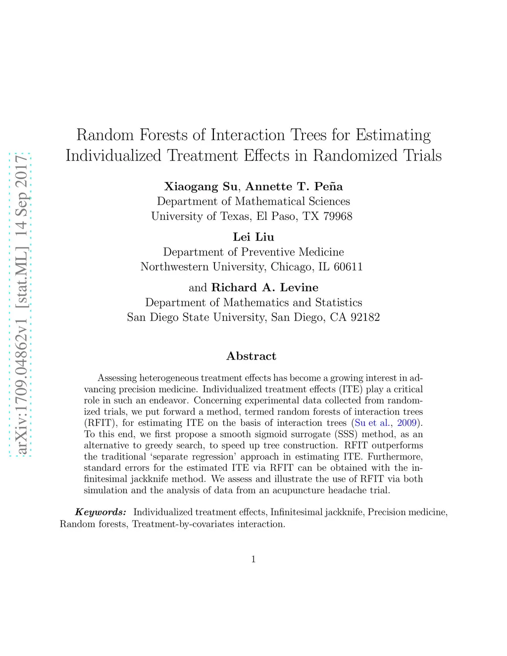 Assessing heterogeneous treatment effects has become a growing interest in advancing precision medicine. Individualized treatment effects (ITE) play a critical role in such an endeavor. Concerning experimental data collected from randomized trials, we put forward a method, termed random forests of interaction trees (RFIT), for estimating ITE on the basis of interaction trees (Su et al., 2009). To this end, we first propose a smooth sigmoid surrogate (SSS) method, as an alternative to greedy search, to speed up tree construction. RFIT outperforms the traditional `separate regression' approach in estimating ITE. Furthermore, standard errors for the estimated ITE via RFIT can be obtained with the infinitesimal jackknife method. We assess and illustrate the use of RFIT via both simulation and the analysis of data from an acupuncture headache trial.