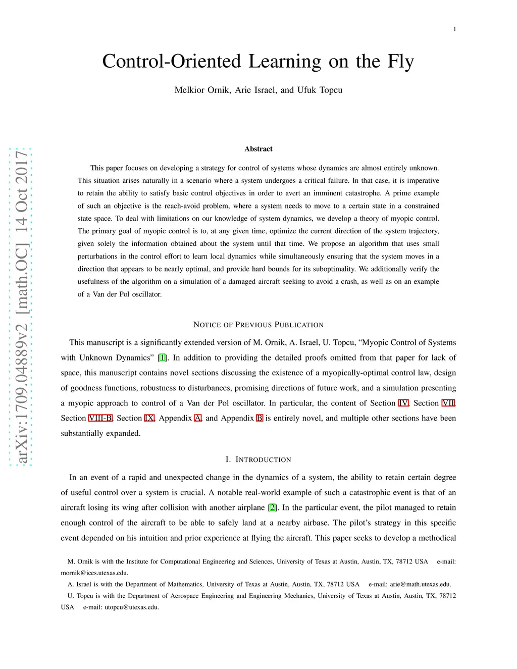 This paper focuses on developing a strategy for control of systems whose dynamics are almost entirely unknown. This situation arises naturally in a scenario where a system undergoes a critical failure. In that case, it is imperative to retain the ability to satisfy basic control objectives in order to avert an imminent catastrophe. A prime example of such an objective is the reach-avoid problem, where a system needs to move to a certain state in a constrained state space. To deal with limitations on our knowledge of system dynamics, we develop a theory of myopic control. The primary goal of myopic control is to, at any given time, optimize the current direction of the system trajectory, given solely the information obtained about the system until that time. We propose an algorithm that uses small perturbations in the control effort to learn local dynamics while simultaneously ensuring that the system moves in a direction that appears to be nearly optimal, and provide hard bounds for its suboptimality. We additionally verify the usefulness of the algorithm on a simulation of a damaged aircraft seeking to avoid a crash, as well as on an example of a Van der Pol oscillator.