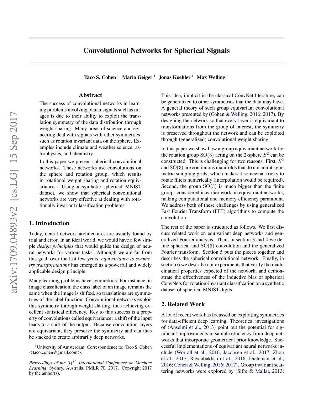 The success of convolutional networks in learning problems involving planar signals such as images is due to their ability to exploit the translation symmetry of the data distribution through weight sharing. Many areas of science and egineering deal with signals with other symmetries, such as rotation invariant data on the sphere. Examples include climate and weather science, astrophysics, and chemistry. In this paper we present spherical convolutional networks. These networks use convolutions on the sphere and rotation group, which results in rotational weight sharing and rotation equivariance. Using a synthetic spherical MNIST dataset, we show that spherical convolutional networks are very effective at dealing with rotationally invariant classification problems.