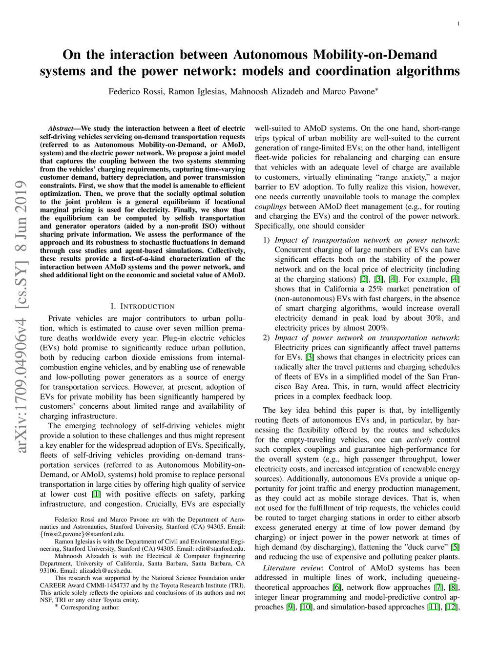 We study the interaction between a fleet of electric, self-driving vehicles servicing on-demand transportation requests (referred to as Autonomous Mobility-on-Demand, or AMoD, system) and the electric power network. We propose a model that captures the coupling between the two systems stemming from the vehicles' charging requirements and captures time-varying customer demand and power generation costs, road congestion, battery depreciation, and power transmission and distribution constraints. We then leverage the model to jointly optimize the operation of both systems. We devise an algorithmic procedure to losslessly reduce the problem size by bundling customer requests, allowing it to be efficiently solved by off-the-shelf linear programming solvers. Next, we show that the socially optimal solution to the joint problem can be enforced as a general equilibrium, and we provide a dual decomposition algorithm that allows self-interested agents to compute the market clearing prices without sharing private information. We assess the performance of the mode by studying a hypothetical AMoD system in Dallas-Fort Worth and its impact on the Texas power network. Lack of coordination between the AMoD system and the power network can cause a 4.4% increase in the price of electricity in Dallas-Fort Worth; conversely, coordination between the AMoD system and the power network could reduce electricity expenditure compared to the case where no cars are present (despite the increased demand for electricity) and yield savings of up $147M/year. Finally, we provide a receding-horizon implementation and assess its performance with agent-based simulations. Collectively, the results of this paper provide a first-of-a-kind characterization of the interaction between electric-powered AMoD systems and the power network, and shed additional light on the economic and societal value of AMoD.