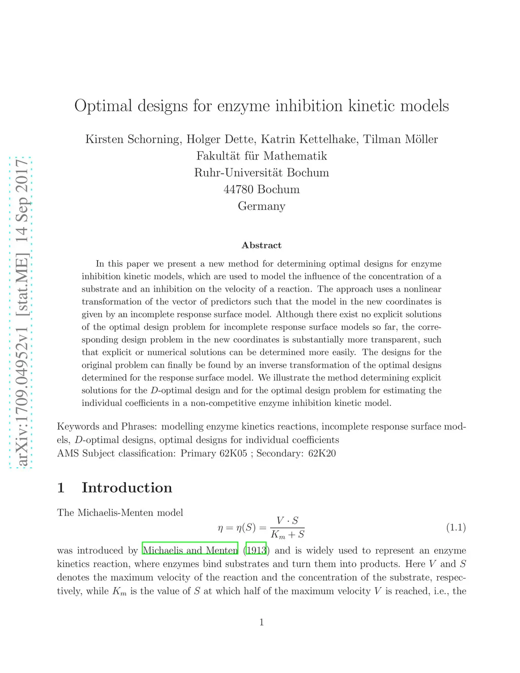 In this paper we present a new method for determining optimal designs for enzyme inhibition kinetic models, which are used to model the influence of the concentration of a substrate and an inhibition on the velocity of a reaction. The approach uses a nonlinear transformation of the vector of predictors such that the model in the new coordinates is given by an incomplete response surface model. Although there exist no explicit solutions of the optimal design problem for incomplete response surface models so far, the corresponding design problem in the new coordinates is substantially more transparent, such that explicit or numerical solutions can be determined more easily. The designs for the original problem can finally be found by an inverse transformation of the optimal designs determined for the response surface model. We illustrate the method determining explicit solutions for the -optimal design and for the optimal design problem for estimating the individual coefficients in a non-competitive enzyme inhibition kinetic model.