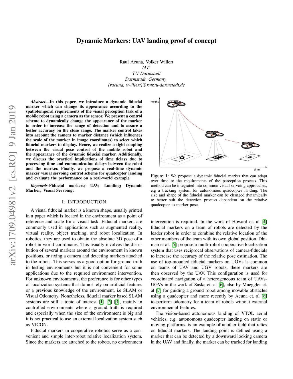 In this paper, we introduce a dynamic fiducial marker which can change its appearance according to the spatio-temporal requirements of the visual perception task of a mobile robot using a camera as sensor. We present a control scheme to dynamically change the appearance of the marker such that the pose of the robot can be optimally estimated from the camera image. The appearance control takes into account the dependency of the estimation quality on the current pose of the camera in relation to the marker.Hence, we realize a tight coupling between the visual pose control of the mobile robot and the appearance control of the dynamic fiducial marker. Further on, we discuss the implications of time delays because of processing time and communication delays between the robot and the marker. Finally, we propose a real time dynamic marker visual servoing control scheme for quadcopter landing and evaluate the performance on a real world example.