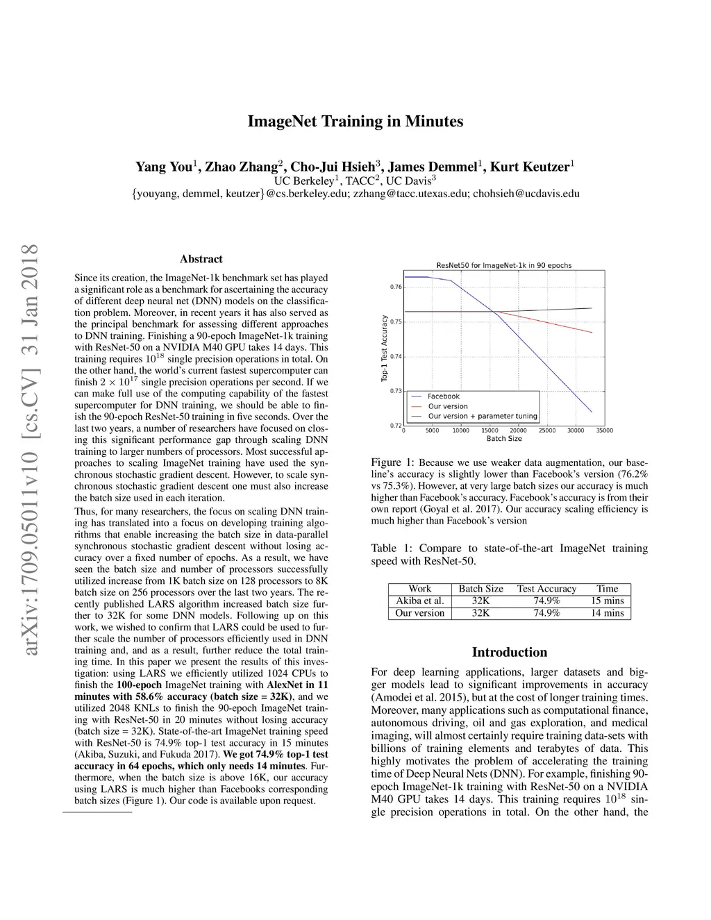 Finishing 90-epoch ImageNet-1k training with ResNet-50 on a NVIDIA M40 GPU takes 14 days. This training requires 10^18 single precision operations in total. On the other hand, the world's current fastest supercomputer can finish 2 * 10^17 single precision operations per second (Dongarra et al 2017, https://www.top500.org/lists/2017/06/). If we can make full use of the supercomputer for DNN training, we should be able to finish the 90-epoch ResNet-50 training in one minute. However, the current bottleneck for fast DNN training is in the algorithm level. Specifically, the current batch size (e.g. 512) is too small to make efficient use of many processors. For large-scale DNN training, we focus on using large-batch data-parallelism synchronous SGD without losing accuracy in the fixed epochs. The LARS algorithm (You, Gitman, Ginsburg, 2017, arXiv:1708.03888) enables us to scale the batch size to extremely large case (e.g. 32K). We finish the 100-epoch ImageNet training with AlexNet in 11 minutes on 1024 CPUs. About three times faster than Facebook's result (Goyal et al 2017, arXiv:1706.02677), we finish the 90-epoch ImageNet training with ResNet-50 in 20 minutes on 2048 KNLs without losing accuracy. Furthermore, when we increase the batch size to above 16K, our accuracy is much higher than Facebook's on corresponding batch sizes. Our source code is available upon request.