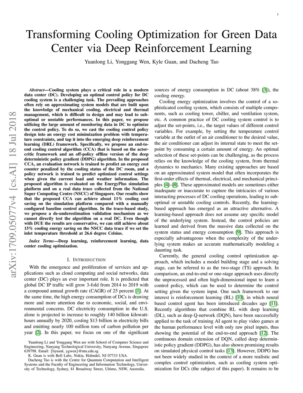 Cooling system plays a critical role in a modern data center (DC). Developing an optimal control policy for DC cooling system is a challenging task. The prevailing approaches often rely on approximating system models that are built upon the knowledge of mechanical cooling, electrical and thermal management, which is difficult to design and may lead to sub-optimal or unstable performances. In this paper, we propose utilizing the large amount of monitoring data in DC to optimize the control policy. To do so, we cast the cooling control policy design into an energy cost minimization problem with temperature constraints, and tap it into the emerging deep reinforcement learning (DRL) framework. Specifically, we propose an end-to-end cooling control algorithm (CCA) that is based on the actor-critic framework and an off-policy offline version of the deep deterministic policy gradient (DDPG) algorithm. In the proposed CCA, an evaluation network is trained to predict an energy cost counter penalized by the cooling status of the DC room, and a policy network is trained to predict optimized control settings when gave the current load and weather information. The proposed algorithm is evaluated on the EnergyPlus simulation platform and on a real data trace collected from the National Super Computing Centre (NSCC) of Singapore. Our results show that the proposed CCA can achieve about 11% cooling cost saving on the simulation platform compared with a manually configured baseline control algorithm. In the trace-based study, we propose a de-underestimation validation mechanism as we cannot directly test the algorithm on a real DC. Even though with DUE the results are conservative, we can still achieve about 15% cooling energy saving on the NSCC data trace if we set the inlet temperature threshold at 26.6 degree Celsius.