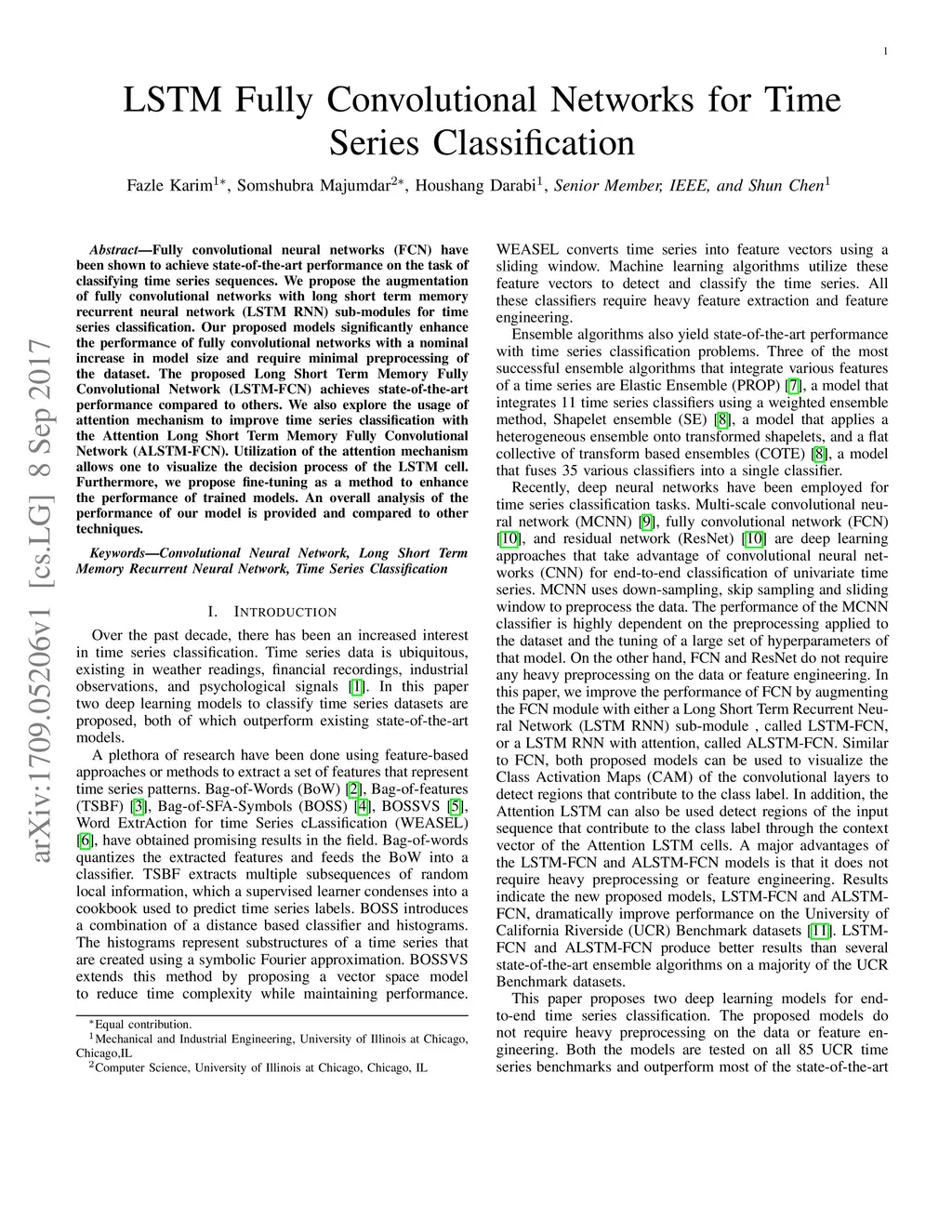 Fully convolutional neural networks (FCN) have been shown to achieve state-of-the-art performance on the task of classifying time series sequences. We propose the augmentation of fully convolutional networks with long short term memory recurrent neural network (LSTM RNN) sub-modules for time series classification. Our proposed models significantly enhance the performance of fully convolutional networks with a nominal increase in model size and require minimal preprocessing of the dataset. The proposed Long Short Term Memory Fully Convolutional Network (LSTM-FCN) achieves state-of-the-art performance compared to others. We also explore the usage of attention mechanism to improve time series classification with the Attention Long Short Term Memory Fully Convolutional Network (ALSTM-FCN). Utilization of the attention mechanism allows one to visualize the decision process of the LSTM cell. Furthermore, we propose fine-tuning as a method to enhance the performance of trained models. An overall analysis of the performance of our model is provided and compared to other techniques.