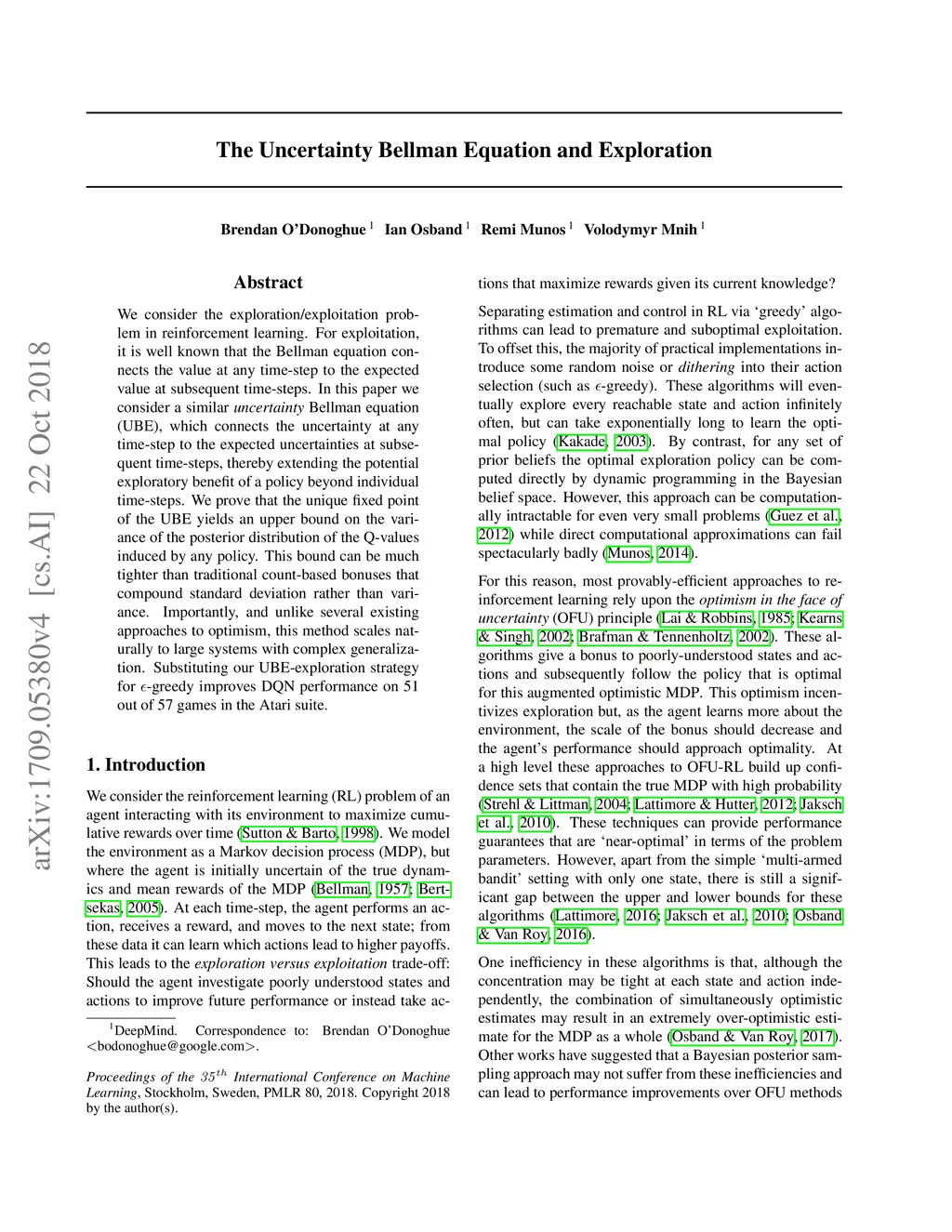 We consider the exploration/exploitation problem in reinforcement learning. For exploitation, it is well known that the Bellman equation connects the value at any time-step to the expected value at subsequent time-steps. In this paper we consider a similar \textit{uncertainty} Bellman equation (UBE), which connects the uncertainty at any time-step to the expected uncertainties at subsequent time-steps, thereby extending the potential exploratory benefit of a policy beyond individual time-steps. We prove that the unique fixed point of the UBE yields an upper bound on the variance of the posterior distribution of the Q-values induced by any policy. This bound can be much tighter than traditional count-based bonuses that compound standard deviation rather than variance. Importantly, and unlike several existing approaches to optimism, this method scales naturally to large systems with complex generalization. Substituting our UBE-exploration strategy for -greedy improves DQN performance on 51 out of 57 games in the Atari suite.