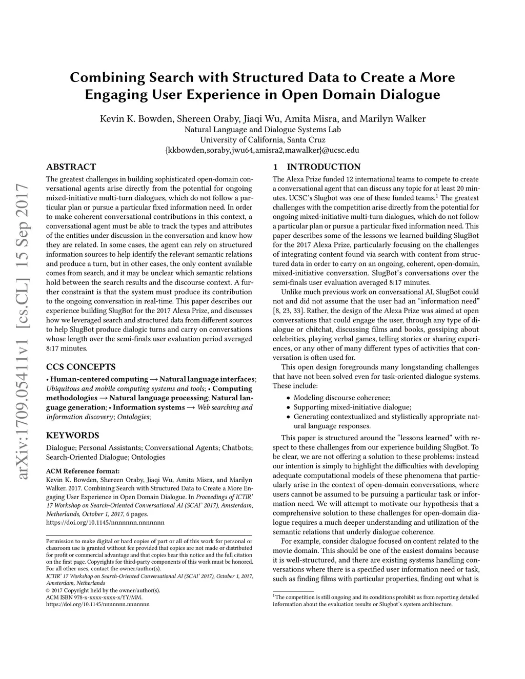 The greatest challenges in building sophisticated open-domain conversational agents arise directly from the potential for ongoing mixed-initiative multi-turn dialogues, which do not follow a particular plan or pursue a particular fixed information need. In order to make coherent conversational contributions in this context, a conversational agent must be able to track the types and attributes of the entities under discussion in the conversation and know how they are related. In some cases, the agent can rely on structured information sources to help identify the relevant semantic relations and produce a turn, but in other cases, the only content available comes from search, and it may be unclear which semantic relations hold between the search results and the discourse context. A further constraint is that the system must produce its contribution to the ongoing conversation in real-time. This paper describes our experience building SlugBot for the 2017 Alexa Prize, and discusses how we leveraged search and structured data from different sources to help SlugBot produce dialogic turns and carry on conversations whose length over the semi-finals user evaluation period averaged 8:17 minutes.