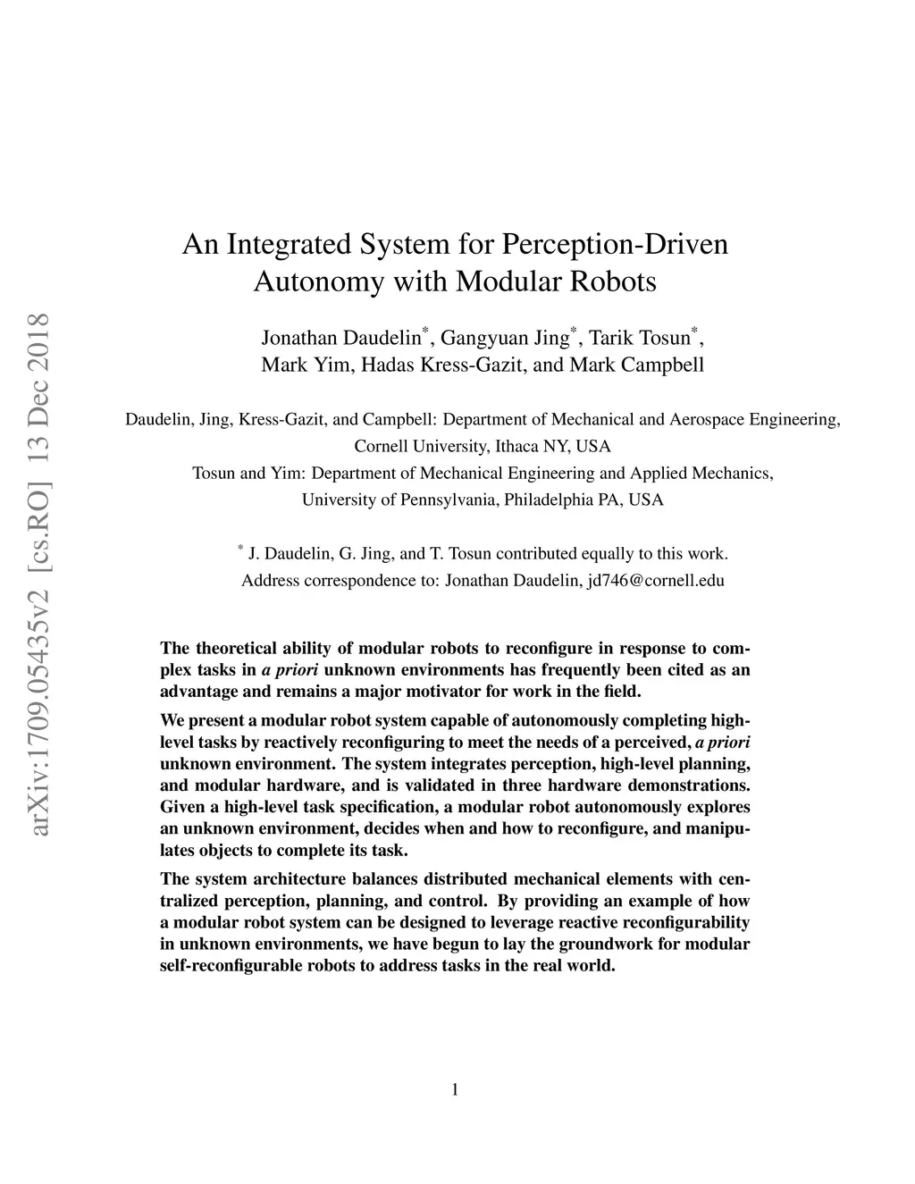 An Integrated System for Perception-Driven Autonomy with Modular Robots