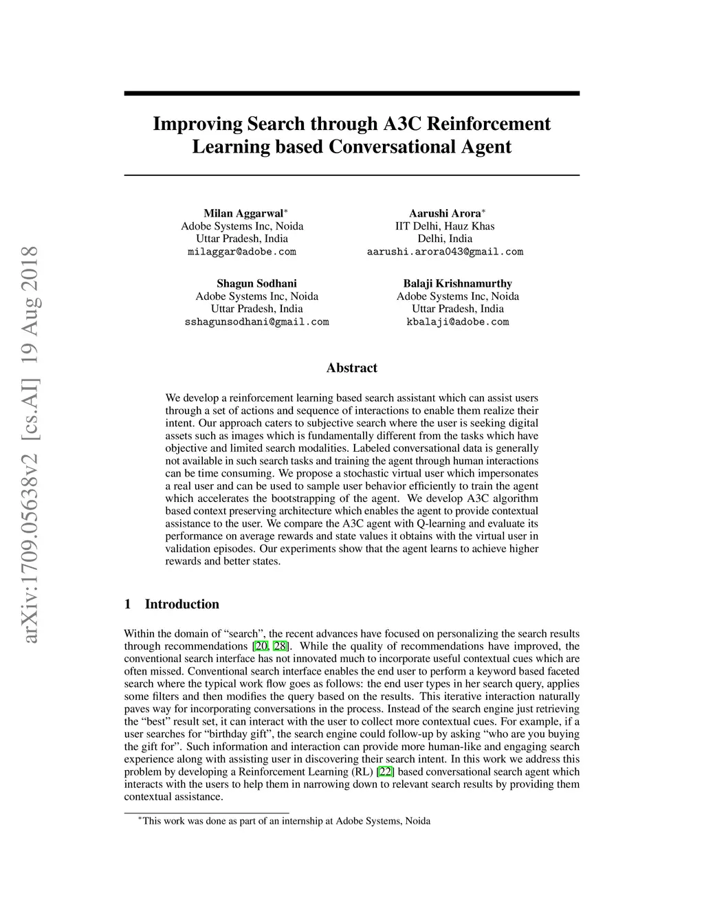 We develop a reinforcement learning based search assistant which can assist users through a set of actions and sequence of interactions to enable them realize their intent. Our approach caters to subjective search where the user is seeking digital assets such as images which is fundamentally different from the tasks which have objective and limited search modalities. Labeled conversational data is generally not available in such search tasks and training the agent through human interactions can be time consuming. We propose a stochastic virtual user which impersonates a real user and can be used to sample user behavior efficiently to train the agent which accelerates the bootstrapping of the agent. We develop A3C algorithm based context preserving architecture which enables the agent to provide contextual assistance to the user. We compare the A3C agent with Q-learning and evaluate its performance on average rewards and state values it obtains with the virtual user in validation episodes. Our experiments show that the agent learns to achieve higher rewards and better states.