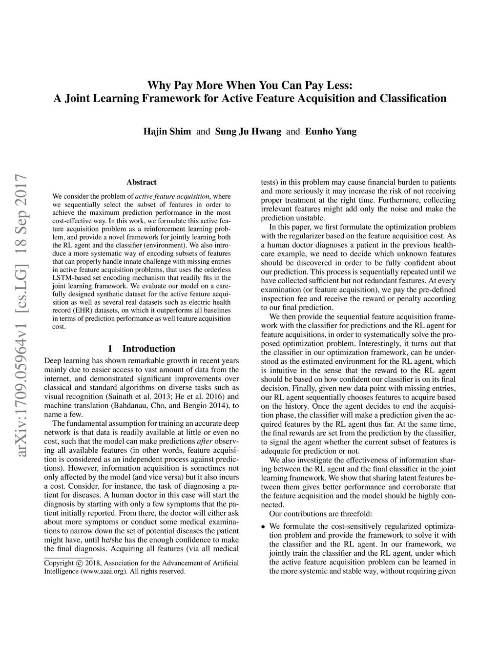 We consider the problem of active feature acquisition, where we sequentially select the subset of features in order to achieve the maximum prediction performance in the most cost-effective way. In this work, we formulate this active feature acquisition problem as a reinforcement learning problem, and provide a novel framework for jointly learning both the RL agent and the classifier (environment). We also introduce a more systematic way of encoding subsets of features that can properly handle innate challenge with missing entries in active feature acquisition problems, that uses the orderless LSTM-based set encoding mechanism that readily fits in the joint learning framework. We evaluate our model on a carefully designed synthetic dataset for the active feature acquisition as well as several real datasets such as electric health record (EHR) datasets, on which it outperforms all baselines in terms of prediction performance as well feature acquisition cost.