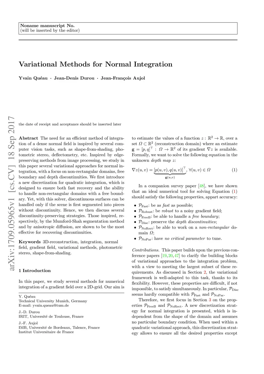 The need for an efficient method of integration of a dense normal field is inspired by several computer vision tasks, such as shape-from-shading, photometric stereo, deflectometry, etc. Inspired by edge-preserving methods from image processing, we study in this paper several variational approaches for normal integration, with a focus on non-rectangular domains, free boundary and depth discontinuities. We first introduce a new discretization for quadratic integration, which is designed to ensure both fast recovery and the ability to handle non-rectangular domains with a free boundary. Yet, with this solver, discontinuous surfaces can be handled only if the scene is first segmented into pieces without discontinuity. Hence, we then discuss several discontinuity-preserving strategies. Those inspired, respectively, by the Mumford-Shah segmentation method and by anisotropic diffusion, are shown to be the most effective for recovering discontinuities.