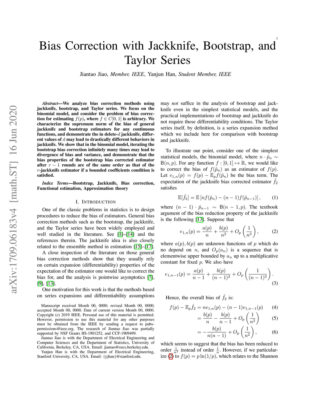 We analyze bias correction methods using jackknife, bootstrap, and Taylor series. We focus on the binomial model, and consider the problem of bias correction for estimating , where is arbitrary. We characterize the supremum norm of the bias of general jackknife and bootstrap estimators for any continuous functions, and demonstrate the in delete- jackknife, different values of may lead to drastically different behaviors in jackknife. We show that in the binomial model, iterating the bootstrap bias correction infinitely many times may lead to divergence of bias and variance, and demonstrate that the bias properties of the bootstrap bias corrected estimator after rounds are of the same order as that of the -jackknife estimator if a bounded coefficients condition is satisfied.