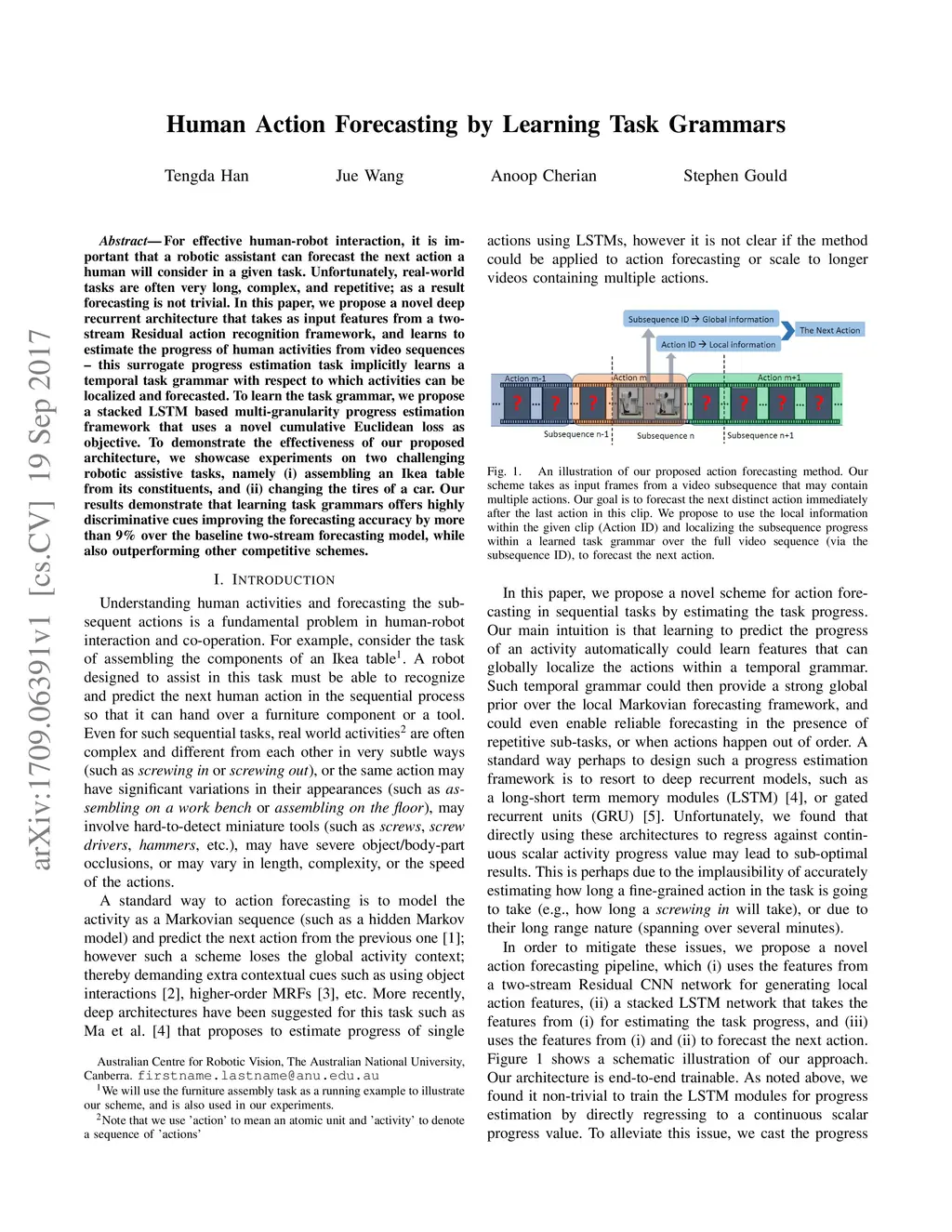 For effective human-robot interaction, it is important that a robotic assistant can forecast the next action a human will consider in a given task. Unfortunately, real-world tasks are often very long, complex, and repetitive; as a result forecasting is not trivial. In this paper, we propose a novel deep recurrent architecture that takes as input features from a two-stream Residual action recognition framework, and learns to estimate the progress of human activities from video sequences -- this surrogate progress estimation task implicitly learns a temporal task grammar with respect to which activities can be localized and forecasted. To learn the task grammar, we propose a stacked LSTM based multi-granularity progress estimation framework that uses a novel cumulative Euclidean loss as objective. To demonstrate the effectiveness of our proposed architecture, we showcase experiments on two challenging robotic assistive tasks, namely (i) assembling an Ikea table from its constituents, and (ii) changing the tires of a car. Our results demonstrate that learning task grammars offers highly discriminative cues improving the forecasting accuracy by more than 9% over the baseline two-stream forecasting model, while also outperforming other competitive schemes.