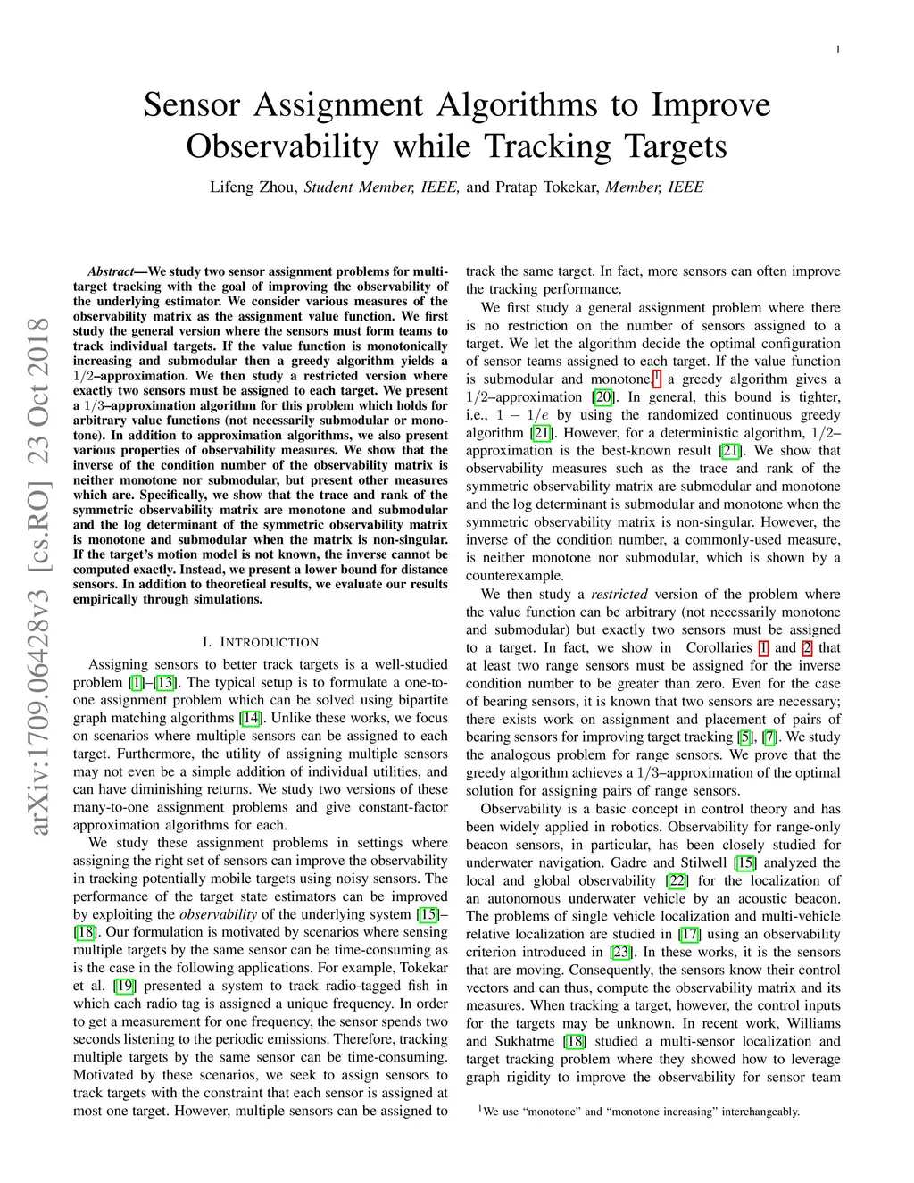 We study two sensor assignment problems for multi-target tracking with the goal of improving the observability of the underlying estimator. In the restricted version of the problem, we focus on assigning unique pairs of sensors to each target. We present a 1/3-approximation algorithm for this problem. We use the inverse of the condition number as the value function. If the target's motion model is not known, the inverse cannot be computed exactly. Instead, we present a lower bound for range-only sensing. In the general version, the sensors must form teams to track individual targets. We do not force any specific constraints on the size of each team, instead assume that the value function is monotonically increasing and is submodular. A greedy algorithm that yields a 1/2-approximation. However, we show that the inverse of the condition number is neither monotone nor submodular. Instead, we present other measures that are monotone and submodular. In addition to theoretical results, we evaluate our results empirically through simulations.