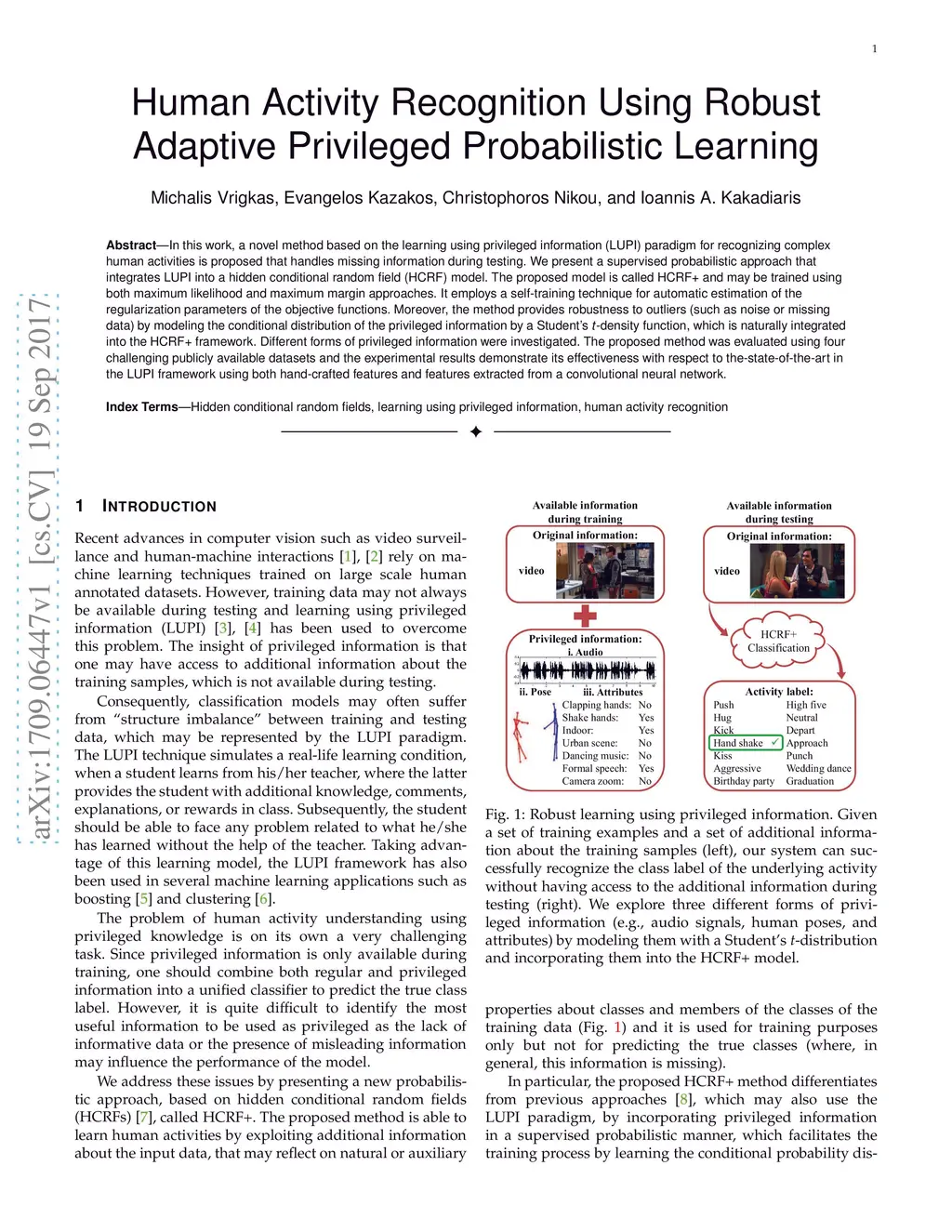 In this work, a novel method based on the learning using privileged information (LUPI) paradigm for recognizing complex human activities is proposed that handles missing information during testing. We present a supervised probabilistic approach that integrates LUPI into a hidden conditional random field (HCRF) model. The proposed model is called HCRF+ and may be trained using both maximum likelihood and maximum margin approaches. It employs a self-training technique for automatic estimation of the regularization parameters of the objective functions. Moreover, the method provides robustness to outliers (such as noise or missing data) by modeling the conditional distribution of the privileged information by a Student's \textit{t}-density function, which is naturally integrated into the HCRF+ framework. Different forms of privileged information were investigated. The proposed method was evaluated using four challenging publicly available datasets and the experimental results demonstrate its effectiveness with respect to the-state-of-the-art in the LUPI framework using both hand-crafted features and features extracted from a convolutional neural network.