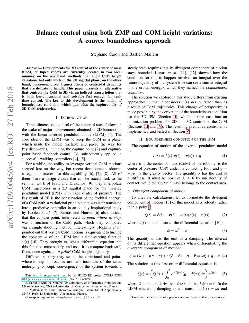 Developments for 3D control of the center of mass (CoM) of biped robots are currently located in two local minima: on the one hand, methods that allow CoM height variations but only work in the 2D sagittal plane; on the other hand, nonconvex direct transcriptions of centroidal dynamics that are delicate to handle. This paper presents an alternative that controls the CoM in 3D via an indirect transcription that is both low-dimensional and solvable fast enough for real-time control. The key to this development is the notion of boundedness condition, which quantifies the capturability of 3D CoM trajectories.