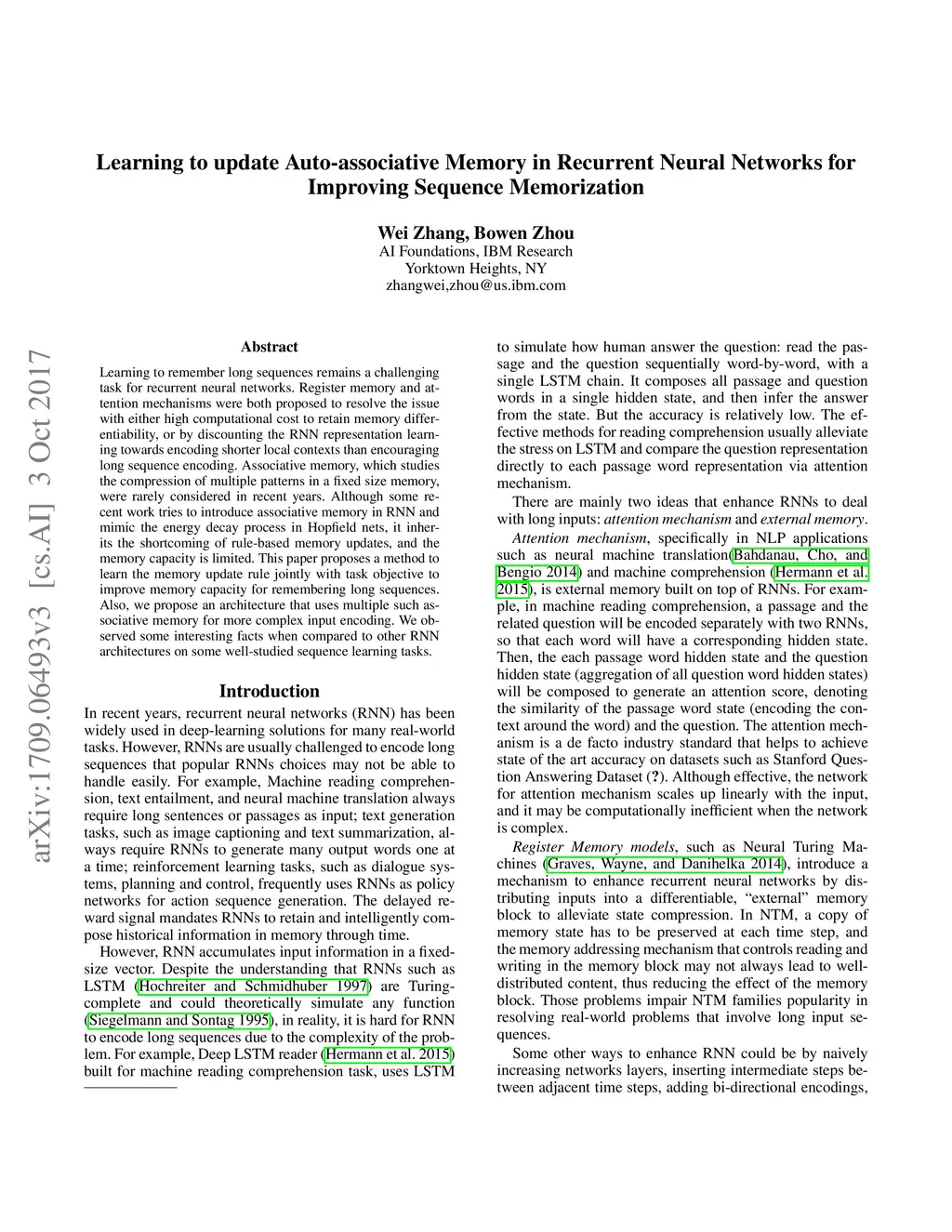 Learning to update Auto-associative Memory in Recurrent Neural Networks