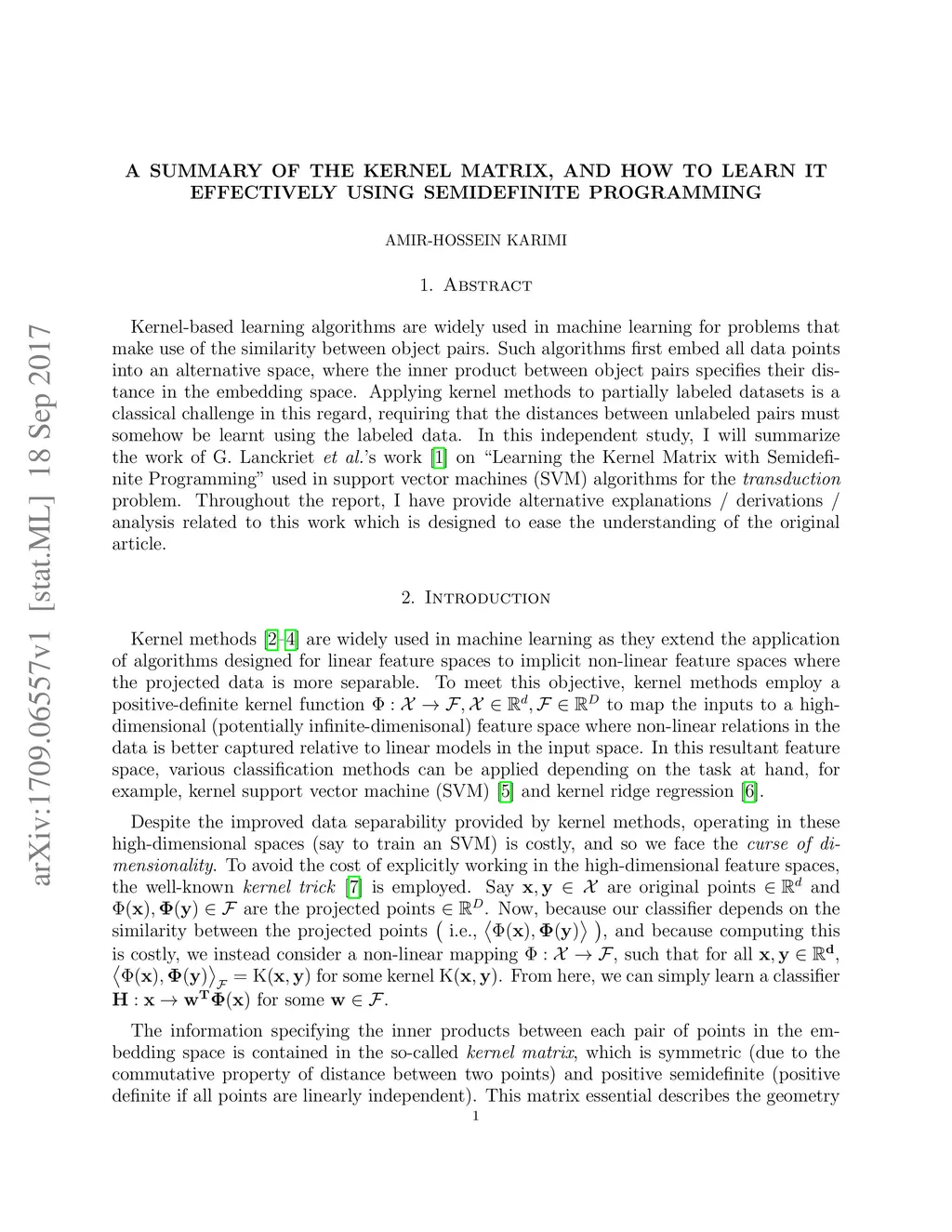 Kernel-based learning algorithms are widely used in machine learning for problems that make use of the similarity between object pairs. Such algorithms first embed all data points into an alternative space, where the inner product between object pairs specifies their distance in the embedding space. Applying kernel methods to partially labeled datasets is a classical challenge in this regard, requiring that the distances between unlabeled pairs must somehow be learnt using the labeled data. In this independent study, I will summarize the work of G. Lanckriet et al.'s work on "Learning the Kernel Matrix with Semidefinite Programming" used in support vector machines (SVM) algorithms for the transduction problem. Throughout the report, I have provide alternative explanations / derivations / analysis related to this work which is designed to ease the understanding of the original article.