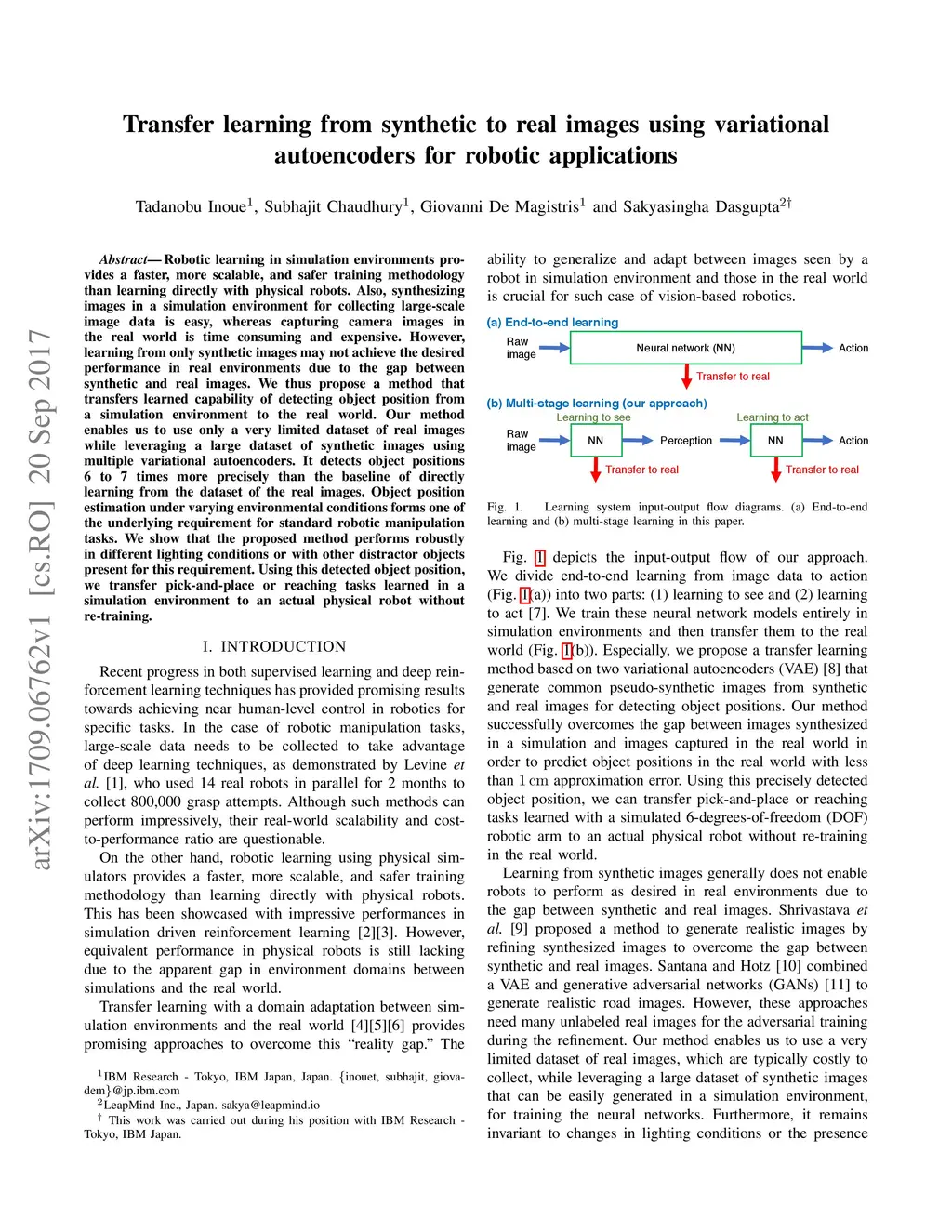 Robotic learning in simulation environments provides a faster, more scalable, and safer training methodology than learning directly with physical robots. Also, synthesizing images in a simulation environment for collecting large-scale image data is easy, whereas capturing camera images in the real world is time consuming and expensive. However, learning from only synthetic images may not achieve the desired performance in real environments due to the gap between synthetic and real images. We thus propose a method that transfers learned capability of detecting object position from a simulation environment to the real world. Our method enables us to use only a very limited dataset of real images while leveraging a large dataset of synthetic images using multiple variational autoencoders. It detects object positions 6 to 7 times more precisely than the baseline of directly learning from the dataset of the real images. Object position estimation under varying environmental conditions forms one of the underlying requirement for standard robotic manipulation tasks. We show that the proposed method performs robustly in different lighting conditions or with other distractor objects present for this requirement. Using this detected object position, we transfer pick-and-place or reaching tasks learned in a simulation environment to an actual physical robot without re-training.