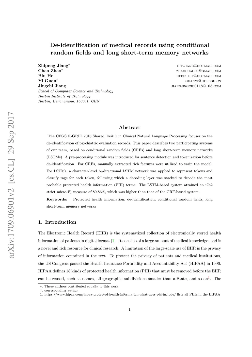 The CEGS N-GRID 2016 Shared Task 1 in Clinical Natural Language Processing focuses on the de-identification of psychiatric evaluation records. This paper describes two participating systems of our team, based on conditional random fields (CRFs) and long short-term memory networks (LSTMs). A pre-processing module was introduced for sentence detection and tokenization before de-identification. For CRFs, manually extracted rich features were utilized to train the model. For LSTMs, a character-level bi-directional LSTM network was applied to represent tokens and classify tags for each token, following which a decoding layer was stacked to decode the most probable protected health information (PHI) terms. The LSTM-based system attained an i2b2 strict micro-F_1 measure of 89.86%, which was higher than that of the CRF-based system.