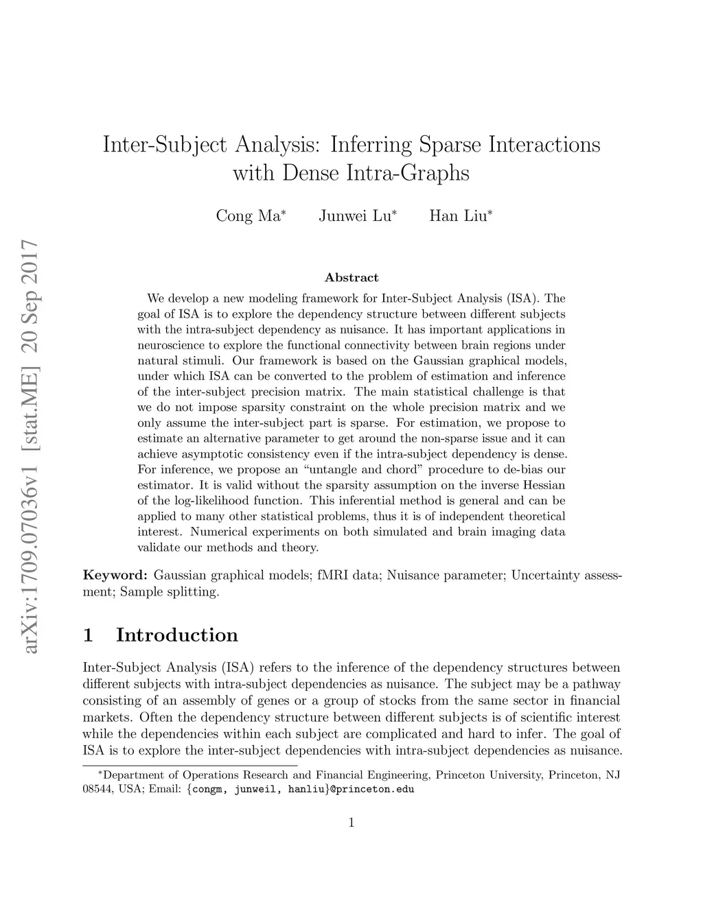 We develop a new modeling framework for Inter-Subject Analysis (ISA). The goal of ISA is to explore the dependency structure between different subjects with the intra-subject dependency as nuisance. It has important applications in neuroscience to explore the functional connectivity between brain regions under natural stimuli. Our framework is based on the Gaussian graphical models, under which ISA can be converted to the problem of estimation and inference of the inter-subject precision matrix. The main statistical challenge is that we do not impose sparsity constraint on the whole precision matrix and we only assume the inter-subject part is sparse. For estimation, we propose to estimate an alternative parameter to get around the non-sparse issue and it can achieve asymptotic consistency even if the intra-subject dependency is dense. For inference, we propose an "untangle and chord" procedure to de-bias our estimator. It is valid without the sparsity assumption on the inverse Hessian of the log-likelihood function. This inferential method is general and can be applied to many other statistical problems, thus it is of independent theoretical interest. Numerical experiments on both simulated and brain imaging data validate our methods and theory.