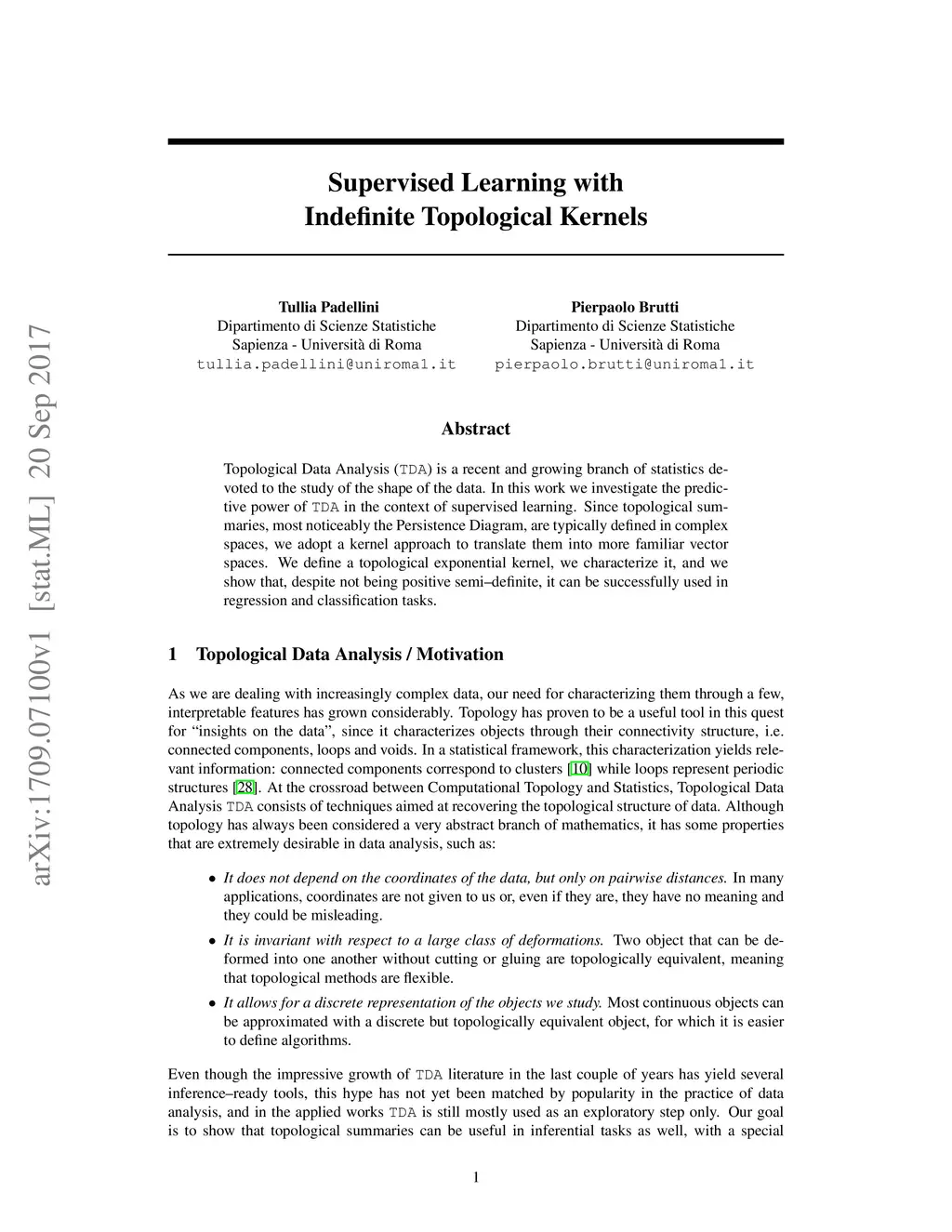 Supervised Learning with Indefinite Topological Kernels