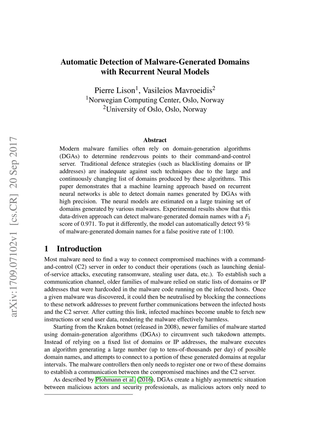 Automatic Detection of Malware-Generated Domains with Recurrent Neural