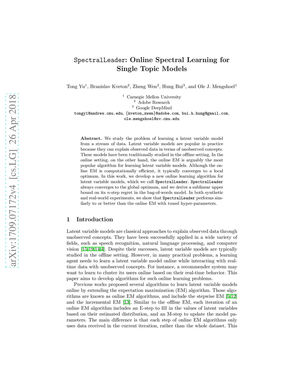 SpectralLeader: Online Spectral Learning for Single Topic Models