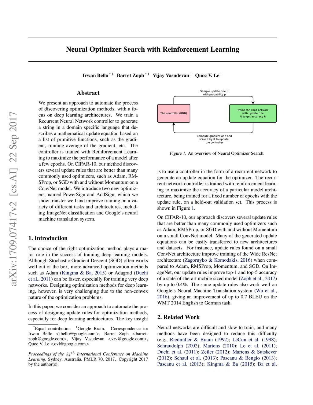 Neural Optimizer Search with Reinforcement Learning