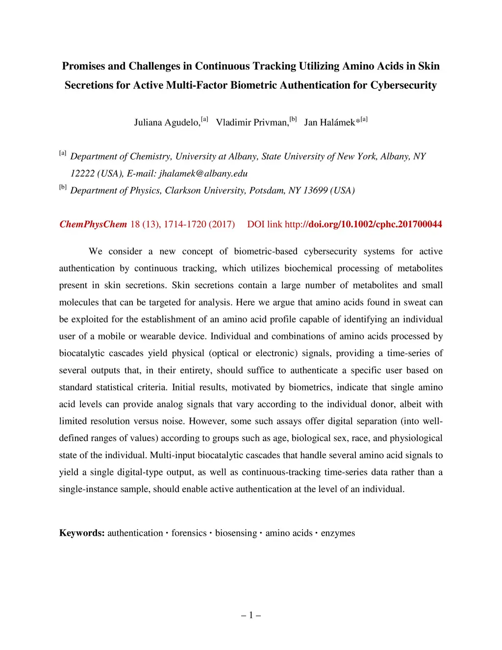 We consider a new concept of biometric-based cybersecurity systems for active authentication by continuous tracking, which utilizes biochemical processing of metabolites present in skin secretions. Skin secretions contain a large number of metabolites and small molecules that can be targeted for analysis. Here we argue that amino acids found in sweat can be exploited for the establishment of an amino acid profile capable of identifying an individual user of a mobile or wearable device. Individual and combinations of amino acids processed by biocatalytic cascades yield physical (optical or electronic) signals, providing a time-series of several outputs that, in their entirety, should suffice to authenticate a specific user based on standard statistical criteria. Initial results, motivated by biometrics, indicate that single amino acid levels can provide analog signals that vary according to the individual donor, albeit with limited resolution versus noise. However, some such assays offer digital separation (into well-defined ranges of values) according to groups such as age, biological sex, race, and physiological state of the individual. Multi-input biocatalytic cascades that handle several amino acid signals to yield a single digital-type output, as well as continuous-tracking time-series data rather than a single-instance sample, should enable active authentication at the level of an individual.