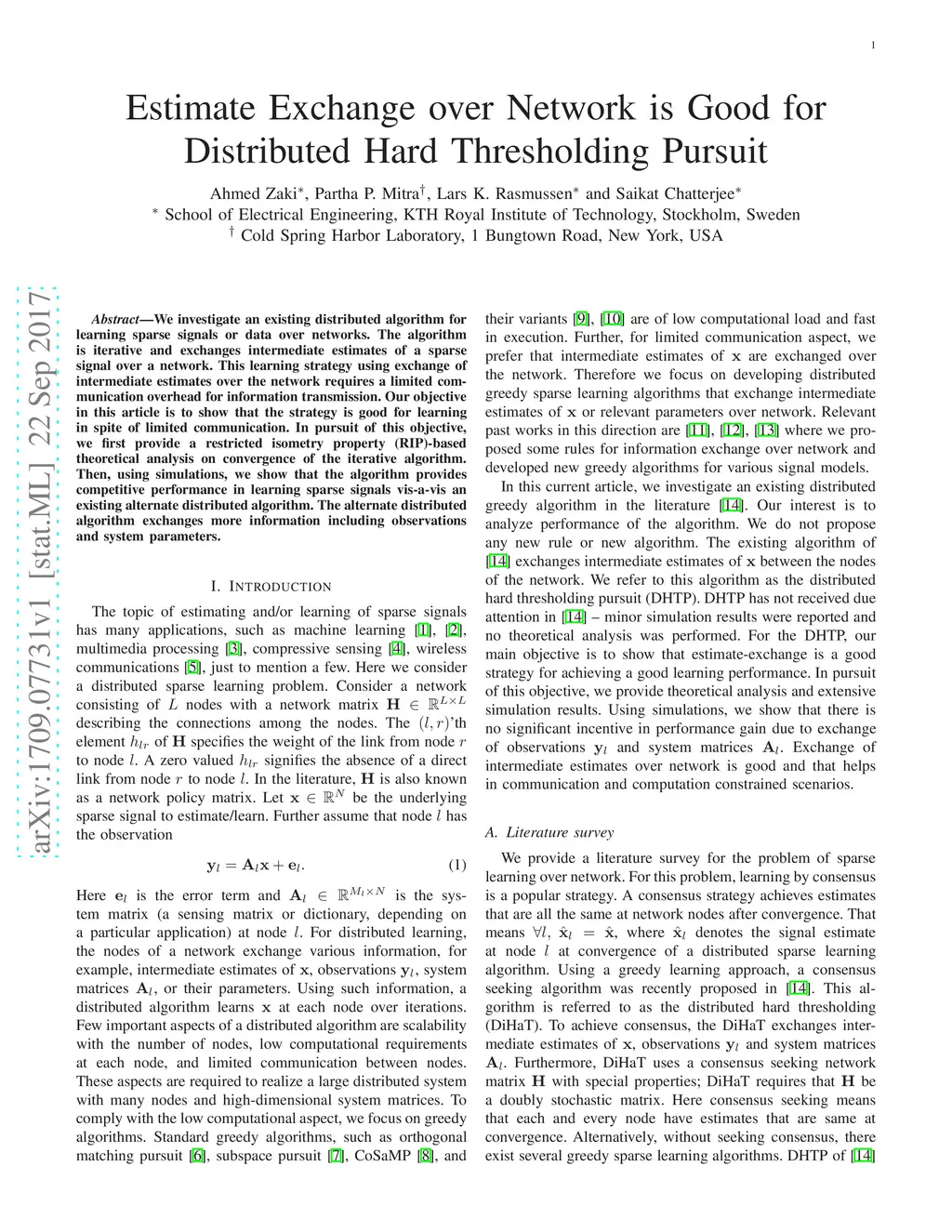 We investigate an existing distributed algorithm for learning sparse signals or data over networks. The algorithm is iterative and exchanges intermediate estimates of a sparse signal over a network. This learning strategy using exchange of intermediate estimates over the network requires a limited communication overhead for information transmission. Our objective in this article is to show that the strategy is good for learning in spite of limited communication. In pursuit of this objective, we first provide a restricted isometry property (RIP)-based theoretical analysis on convergence of the iterative algorithm. Then, using simulations, we show that the algorithm provides competitive performance in learning sparse signals vis-a-vis an existing alternate distributed algorithm. The alternate distributed algorithm exchanges more information including observations and system parameters.