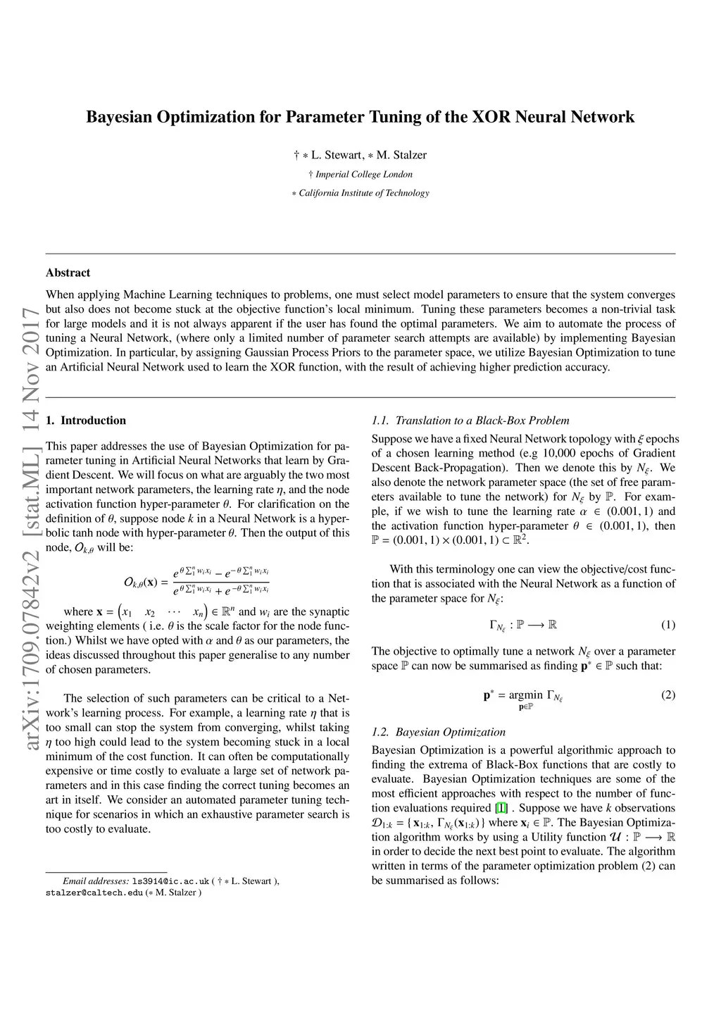 Bayesian Optimization for Parameter Tuning of the XOR Neural Network