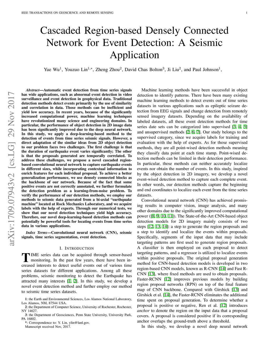 Automatic event detection from time series signals has wide applications, such as abnormal event detection in video surveillance and event detection in geophysical data. Traditional detection methods detect events primarily by the use of similarity and correlation in data. Those methods can be inefficient and yield low accuracy. In recent years, because of the significantly increased computational power, machine learning techniques have revolutionized many science and engineering domains. In this study, we apply a deep-learning-based method to the detection of events from time series seismic signals. However, a direct adaptation of the similar ideas from 2D object detection to our problem faces two challenges. The first challenge is that the duration of earthquake event varies significantly; The other is that the proposals generated are temporally correlated. To address these challenges, we propose a novel cascaded region-based convolutional neural network to capture earthquake events in different sizes, while incorporating contextual information to enrich features for each individual proposal. To achieve a better generalization performance, we use densely connected blocks as the backbone of our network. Because of the fact that some positive events are not correctly annotated, we further formulate the detection problem as a learning-from-noise problem. To verify the performance of our detection methods, we employ our methods to seismic data generated from a bi-axial "earthquake machine" located at Rock Mechanics Laboratory, and we acquire labels with the help of experts. Through our numerical tests, we show that our novel detection techniques yield high accuracy. Therefore, our novel deep-learning-based detection methods can potentially be powerful tools for locating events from time series data in various applications.