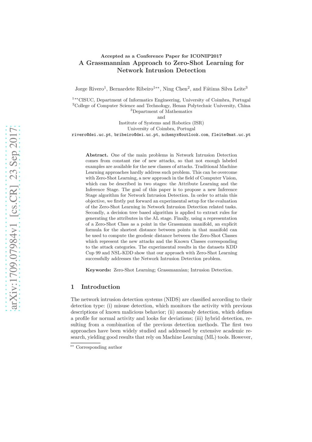 One of the main problems in Network Intrusion Detection comes from constant rise of new attacks, so that not enough labeled examples are available for the new classes of attacks. Traditional Machine Learning approaches hardly address such problem. This can be overcome with Zero-Shot Learning, a new approach in the field of Computer Vision, which can be described in two stages: the Attribute Learning and the Inference Stage. The goal of this paper is to propose a new Inference Stage algorithm for Network Intrusion Detection. In order to attain this objective, we firstly put forward an experimental setup for the evaluation of the Zero-Shot Learning in Network Intrusion Detection related tasks. Secondly, a decision tree based algorithm is applied to extract rules for generating the attributes in the AL stage. Finally, using a representation of a Zero-Shot Class as a point in the Grassmann manifold, an explicit formula for the shortest distance between points in that manifold can be used to compute the geodesic distance between the Zero-Shot Classes which represent the new attacks and the Known Classes corresponding to the attack categories. The experimental results in the datasets KDD Cup 99 and NSL-KDD show that our approach with Zero-Shot Learning successfully addresses the Network Intrusion Detection problem.