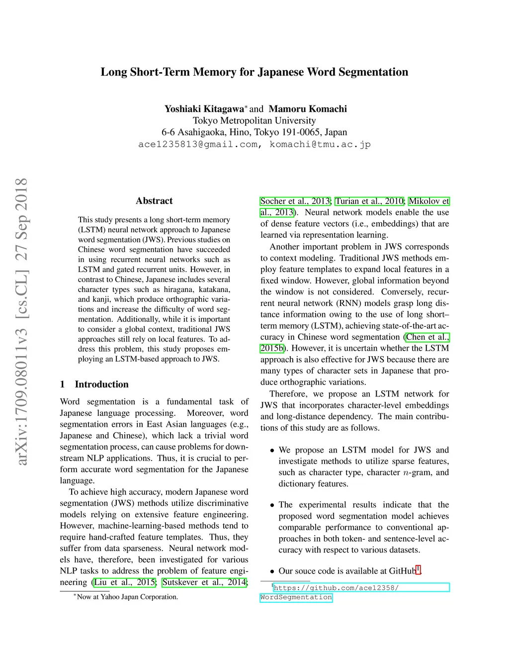 This study presents a Long Short-Term Memory (LSTM) neural network approach to Japanese word segmentation (JWS). Previous studies on Chinese word segmentation (CWS) succeeded in using recurrent neural networks such as LSTM and gated recurrent units (GRU). However, in contrast to Chinese, Japanese includes several character types, such as hiragana, katakana, and kanji, that produce orthographic variations and increase the difficulty of word segmentation. Additionally, it is important for JWS tasks to consider a global context, and yet traditional JWS approaches rely on local features. In order to address this problem, this study proposes employing an LSTM-based approach to JWS. The experimental results indicate that the proposed model achieves state-of-the-art accuracy with respect to various Japanese corpora.