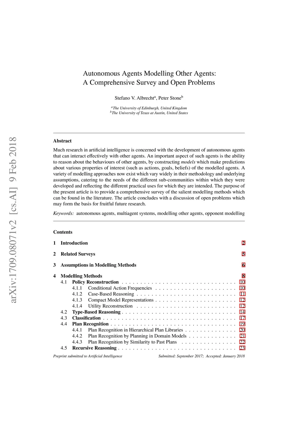 Much research in artificial intelligence is concerned with the development of autonomous agents that can interact effectively with other agents. An important aspect of such agents is the ability to reason about the behaviours of other agents, by constructing models which make predictions about various properties of interest (such as actions, goals, beliefs) of the modelled agents. A variety of modelling approaches now exist which vary widely in their methodology and underlying assumptions, catering to the needs of the different sub-communities within which they were developed and reflecting the different practical uses for which they are intended. The purpose of the present article is to provide a comprehensive survey of the salient modelling methods which can be found in the literature. The article concludes with a discussion of open problems which may form the basis for fruitful future research.