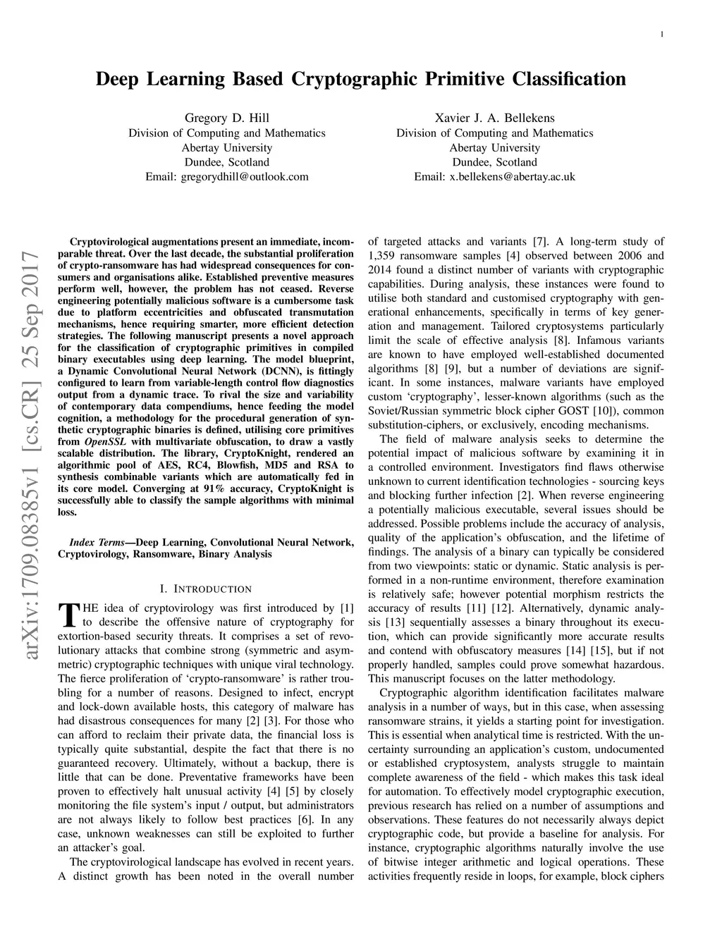 Cryptovirological augmentations present an immediate, incomparable threat. Over the last decade, the substantial proliferation of crypto-ransomware has had widespread consequences for consumers and organisations alike. Established preventive measures perform well, however, the problem has not ceased. Reverse engineering potentially malicious software is a cumbersome task due to platform eccentricities and obfuscated transmutation mechanisms, hence requiring smarter, more efficient detection strategies. The following manuscript presents a novel approach for the classification of cryptographic primitives in compiled binary executables using deep learning. The model blueprint, a DCNN, is fittingly configured to learn from variable-length control flow diagnostics output from a dynamic trace. To rival the size and variability of contemporary data compendiums, hence feeding the model cognition, a methodology for the procedural generation of synthetic cryptographic binaries is defined, utilising core primitives from OpenSSL with multivariate obfuscation, to draw a vastly scalable distribution. The library, CryptoKnight, rendered an algorithmic pool of AES, RC4, Blowfish, MD5 and RSA to synthesis combinable variants which are automatically fed in its core model. Converging at 91% accuracy, CryptoKnight is successfully able to classify the sample algorithms with minimal loss.