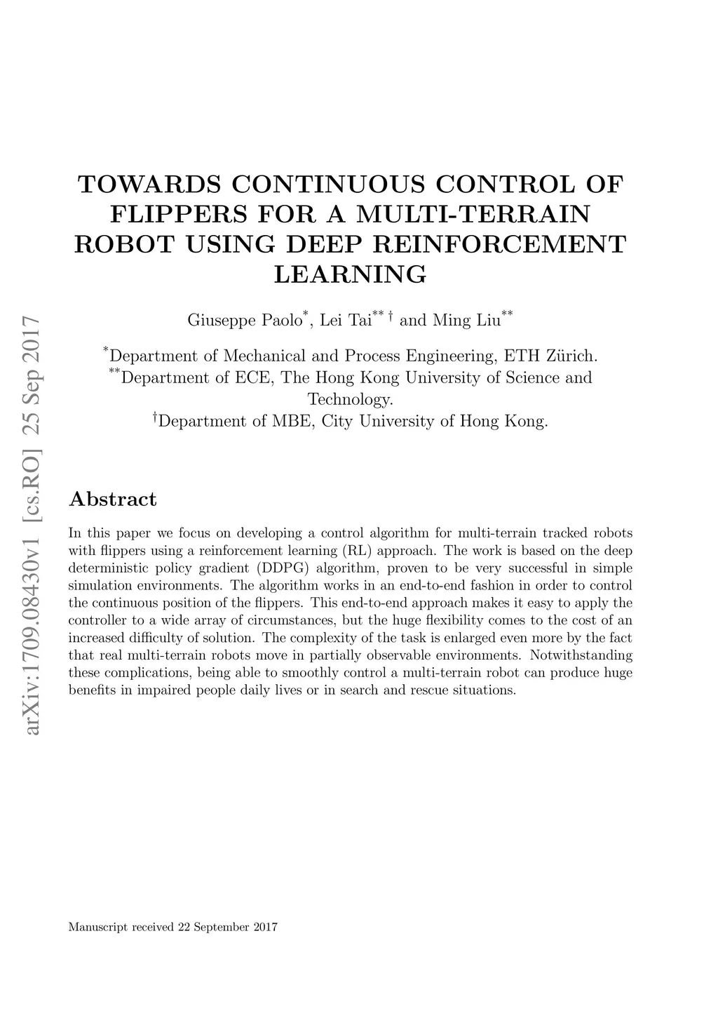 In this paper we focus on developing a control algorithm for multi-terrain tracked robots with flippers using a reinforcement learning (RL) approach. The work is based on the deep deterministic policy gradient (DDPG) algorithm, proven to be very successful in simple simulation environments. The algorithm works in an end-to-end fashion in order to control the continuous position of the flippers. This end-to-end approach makes it easy to apply the controller to a wide array of circumstances, but the huge flexibility comes to the cost of an increased difficulty of solution. The complexity of the task is enlarged even more by the fact that real multi-terrain robots move in partially observable environments. Notwithstanding these complications, being able to smoothly control a multi-terrain robot can produce huge benefits in impaired people daily lives or in search and rescue situations.