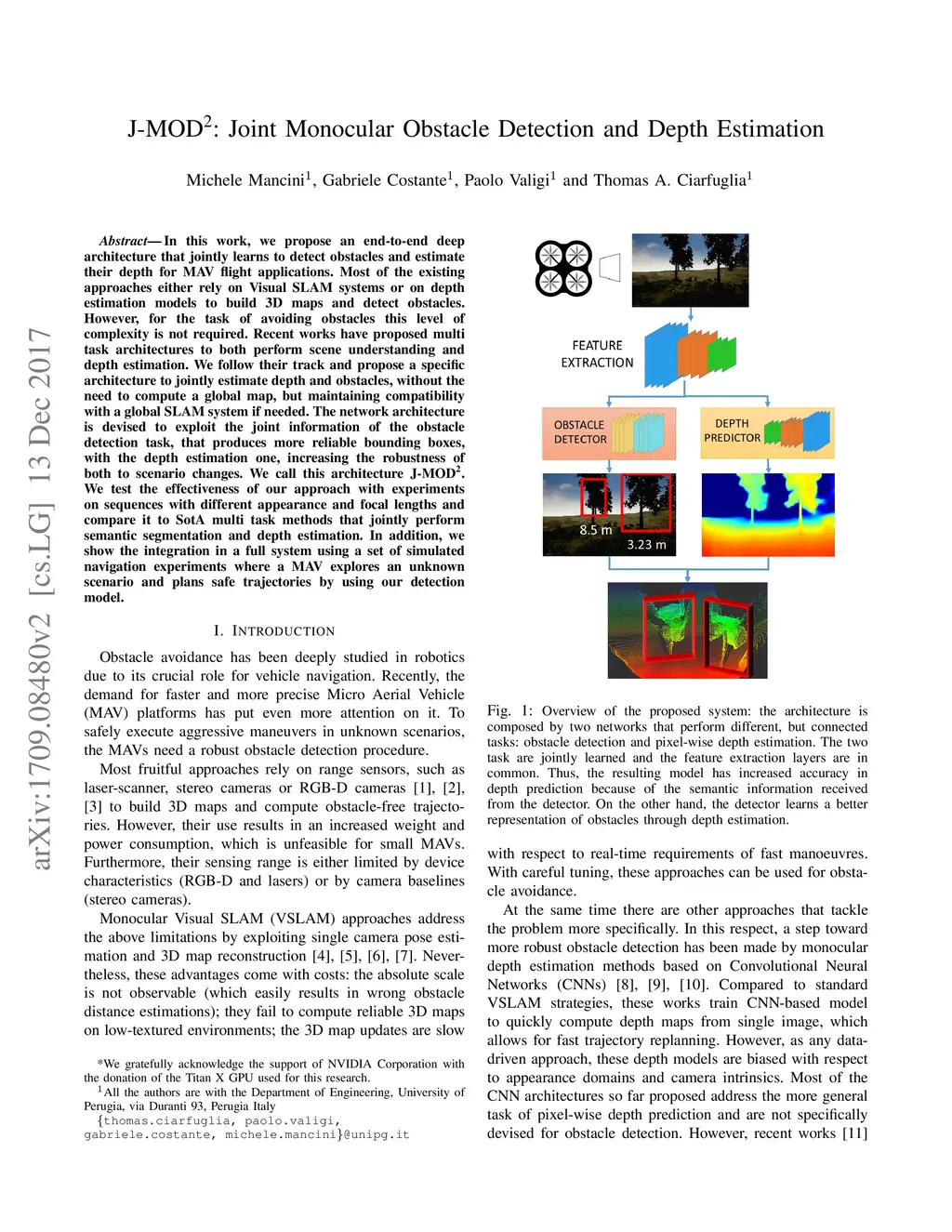 In this work, we propose an end-to-end deep architecture that jointly learns to detect obstacles and estimate their depth for MAV flight applications. Most of the existing approaches either rely on Visual SLAM systems or on depth estimation models to build 3D maps and detect obstacles. However, for the task of avoiding obstacles this level of complexity is not required. Recent works have proposed multi task architectures to both perform scene understanding and depth estimation. We follow their track and propose a specific architecture to jointly estimate depth and obstacles, without the need to compute a global map, but maintaining compatibility with a global SLAM system if needed. The network architecture is devised to exploit the joint information of the obstacle detection task, that produces more reliable bounding boxes, with the depth estimation one, increasing the robustness of both to scenario changes. We call this architecture J-MOD. We test the effectiveness of our approach with experiments on sequences with different appearance and focal lengths and compare it to SotA multi task methods that jointly perform semantic segmentation and depth estimation. In addition, we show the integration in a full system using a set of simulated navigation experiments where a MAV explores an unknown scenario and plans safe trajectories by using our detection model.