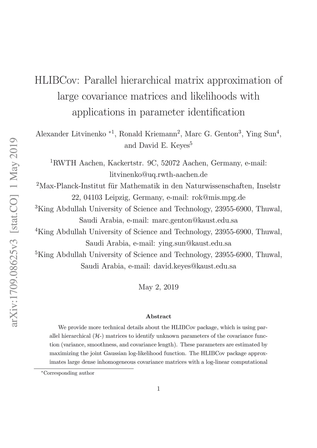We provide more technical details about the HLIBCov package, which is using parallel hierarchical (\H-) matrices to identify unknown parameters of the covariance function (variance, smoothness, and covariance length). These parameters are estimated by maximizing the joint Gaussian log-likelihood function. The HLIBCov package approximates large dense inhomogeneous covariance matrices with a log-linear computational cost and storage requirement. We explain how to compute the Cholesky factorization, determinant, inverse and quadratic form in the H-matrix format. To demonstrate the numerical performance, we identify three unknown parameters in an example with 2,000,000 locations on a PC-desktop.