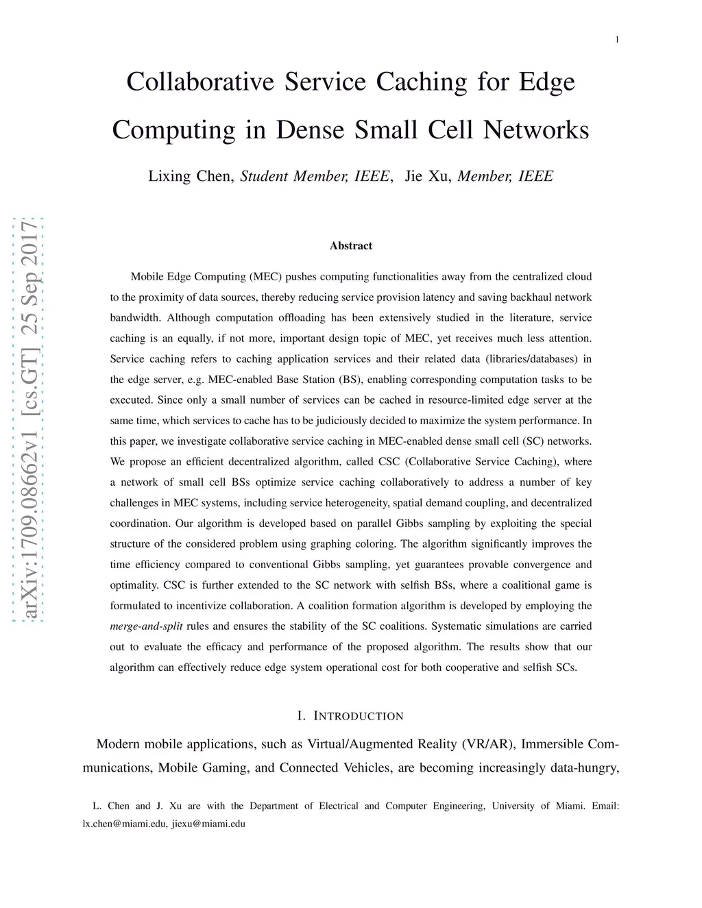 Mobile Edge Computing (MEC) pushes computing functionalities away from the centralized cloud to the proximity of data sources, thereby reducing service provision latency and saving backhaul network bandwidth. Although computation offloading has been extensively studied in the literature, service caching is an equally, if not more, important design topic of MEC, yet receives much less attention. Service caching refers to caching application services and their related data (libraries/databases) in the edge server, e.g. MEC-enabled Base Station (BS), enabling corresponding computation tasks to be executed. Since only a small number of services can be cached in resource-limited edge server at the same time, which services to cache has to be judiciously decided to maximize the system performance. In this paper, we investigate collaborative service caching in MEC-enabled dense small cell (SC) networks. We propose an efficient decentralized algorithm, called CSC (Collaborative Service Caching), where a network of small cell BSs optimize service caching collaboratively to address a number of key challenges in MEC systems, including service heterogeneity, spatial demand coupling, and decentralized coordination. Our algorithm is developed based on parallel Gibbs sampling by exploiting the special structure of the considered problem using graphing coloring. The algorithm significantly improves the time efficiency compared to conventional Gibbs sampling, yet guarantees provable convergence and optimality. CSC is further extended to the SC network with selfish BSs, where a coalitional game is formulated to incentivize collaboration. A coalition formation algorithm is developed by employing the merge-and-split rules and ensures the stability of the SC coalitions.