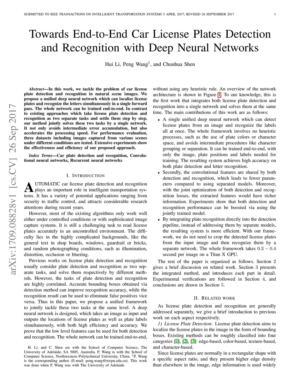 In this work, we tackle the problem of car license plate detection and recognition in natural scene images. We propose a unified deep neural network which can localize license plates and recognize the letters simultaneously in a single forward pass. The whole network can be trained end-to-end. In contrast to existing approaches which take license plate detection and recognition as two separate tasks and settle them step by step, our method jointly solves these two tasks by a single network. It not only avoids intermediate error accumulation, but also accelerates the processing speed. For performance evaluation, three datasets including images captured from various scenes under different conditions are tested. Extensive experiments show the effectiveness and efficiency of our proposed approach.