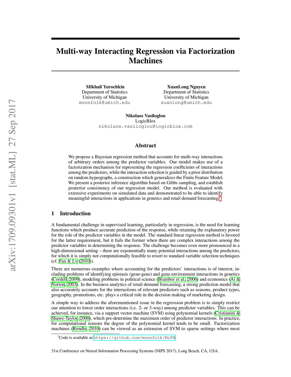 We propose a Bayesian regression method that accounts for multi-way interactions of arbitrary orders among the predictor variables. Our model makes use of a factorization mechanism for representing the regression coefficients of interactions among the predictors, while the interaction selection is guided by a prior distribution on random hypergraphs, a construction which generalizes the Finite Feature Model. We present a posterior inference algorithm based on Gibbs sampling, and establish posterior consistency of our regression model. Our method is evaluated with extensive experiments on simulated data and demonstrated to be able to identify meaningful interactions in applications in genetics and retail demand forecasting.