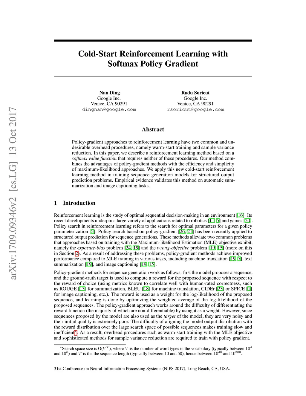 Policy-gradient approaches to reinforcement learning have two common and undesirable overhead procedures, namely warm-start training and sample variance reduction. In this paper, we describe a reinforcement learning method based on a softmax value function that requires neither of these procedures. Our method combines the advantages of policy-gradient methods with the efficiency and simplicity of maximum-likelihood approaches. We apply this new cold-start reinforcement learning method in training sequence generation models for structured output prediction problems. Empirical evidence validates this method on automatic summarization and image captioning tasks.