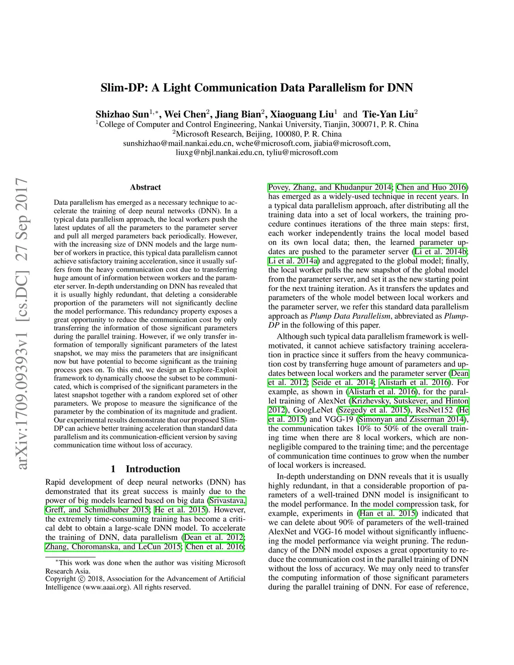 Data parallelism has emerged as a necessary technique to accelerate the training of deep neural networks (DNN). In a typical data parallelism approach, the local workers push the latest updates of all the parameters to the parameter server and pull all merged parameters back periodically. However, with the increasing size of DNN models and the large number of workers in practice, this typical data parallelism cannot achieve satisfactory training acceleration, since it usually suffers from the heavy communication cost due to transferring huge amount of information between workers and the parameter server. In-depth understanding on DNN has revealed that it is usually highly redundant, that deleting a considerable proportion of the parameters will not significantly decline the model performance. This redundancy property exposes a great opportunity to reduce the communication cost by only transferring the information of those significant parameters during the parallel training. However, if we only transfer information of temporally significant parameters of the latest snapshot, we may miss the parameters that are insignificant now but have potential to become significant as the training process goes on. To this end, we design an Explore-Exploit framework to dynamically choose the subset to be communicated, which is comprised of the significant parameters in the latest snapshot together with a random explored set of other parameters. We propose to measure the significance of the parameter by the combination of its magnitude and gradient. Our experimental results demonstrate that our proposed Slim-DP can achieve better training acceleration than standard data parallelism and its communication-efficient version by saving communication time without loss of accuracy.