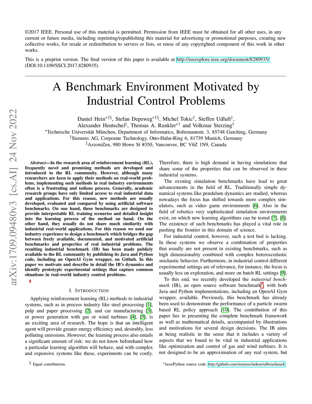 In the research area of reinforcement learning (RL), frequently novel and promising methods are developed and introduced to the RL community. However, although many researchers are keen to apply their methods on real-world problems, implementing such methods in real industry environments often is a frustrating and tedious process. Generally, academic research groups have only limited access to real industrial data and applications. For this reason, new methods are usually developed, evaluated and compared by using artificial software benchmarks. On one hand, these benchmarks are designed to provide interpretable RL training scenarios and detailed insight into the learning process of the method on hand. On the other hand, they usually do not share much similarity with industrial real-world applications. For this reason we used our industry experience to design a benchmark which bridges the gap between freely available, documented, and motivated artificial benchmarks and properties of real industrial problems. The resulting industrial benchmark (IB) has been made publicly available to the RL community by publishing its Java and Python code, including an OpenAI Gym wrapper, on Github. In this paper we motivate and describe in detail the IB's dynamics and identify prototypic experimental settings that capture common situations in real-world industry control problems.