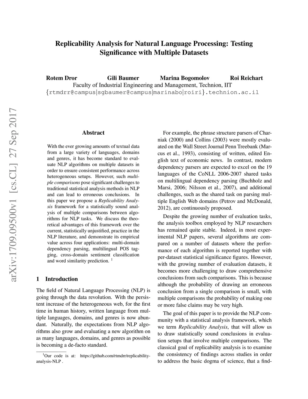 With the ever-growing amounts of textual data from a large variety of languages, domains, and genres, it has become standard to evaluate NLP algorithms on multiple datasets in order to ensure consistent performance across heterogeneous setups. However, such multiple comparisons pose significant challenges to traditional statistical analysis methods in NLP and can lead to erroneous conclusions. In this paper, we propose a Replicability Analysis framework for a statistically sound analysis of multiple comparisons between algorithms for NLP tasks. We discuss the theoretical advantages of this framework over the current, statistically unjustified, practice in the NLP literature, and demonstrate its empirical value across four applications: multi-domain dependency parsing, multilingual POS tagging, cross-domain sentiment classification and word similarity prediction.
