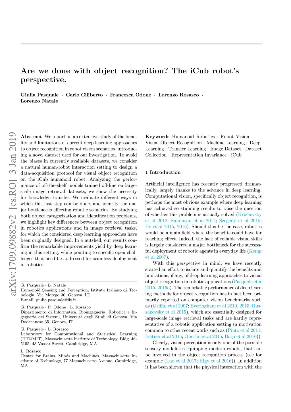 We report on an extensive study of the benefits and limitations of current deep learning approaches to object recognition in robot vision scenarios, introducing a novel dataset used for our investigation. To avoid the biases in currently available datasets, we consider a natural human-robot interaction setting to design a data-acquisition protocol for visual object recognition on the iCub humanoid robot. Analyzing the performance of off-the-shelf models trained off-line on large-scale image retrieval datasets, we show the necessity for knowledge transfer. We evaluate different ways in which this last step can be done, and identify the major bottlenecks affecting robotic scenarios. By studying both object categorization and identification problems, we highlight key differences between object recognition in robotics applications and in image retrieval tasks, for which the considered deep learning approaches have been originally designed. In a nutshell, our results confirm the remarkable improvements yield by deep learning in this setting, while pointing to specific open challenges that need be addressed for seamless deployment in robotics.