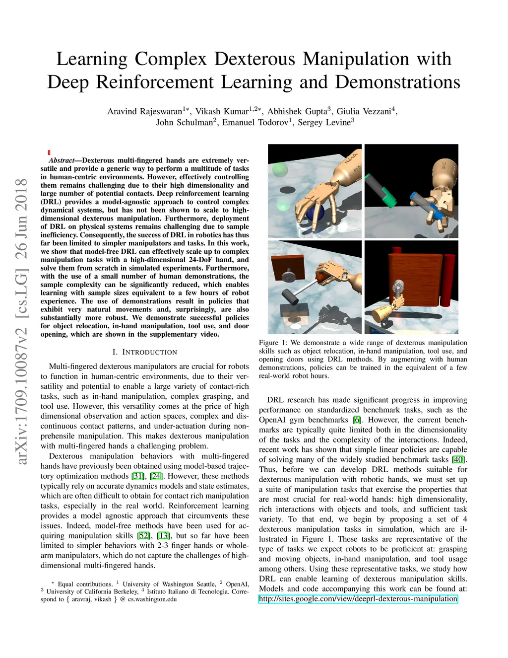 Learning Complex Dexterous Manipulation with Deep Reinforcement Learning
