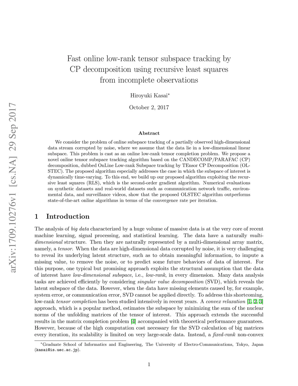 We consider the problem of online subspace tracking of a partially observed high-dimensional data stream corrupted by noise, where we assume that the data lie in a low-dimensional linear subspace. This problem is cast as an online low-rank tensor completion problem. We propose a novel online tensor subspace tracking algorithm based on the CANDECOMP/PARAFAC (CP) decomposition, dubbed OnLine Low-rank Subspace tracking by TEnsor CP Decomposition (OLSTEC). The proposed algorithm especially addresses the case in which the subspace of interest is dynamically time-varying. To this end, we build up our proposed algorithm exploiting the recursive least squares (RLS), which is the second-order gradient algorithm. Numerical evaluations on synthetic datasets and real-world datasets such as communication network traffic, environmental data, and surveillance videos, show that the proposed OLSTEC algorithm outperforms state-of-the-art online algorithms in terms of the convergence rate per iteration.